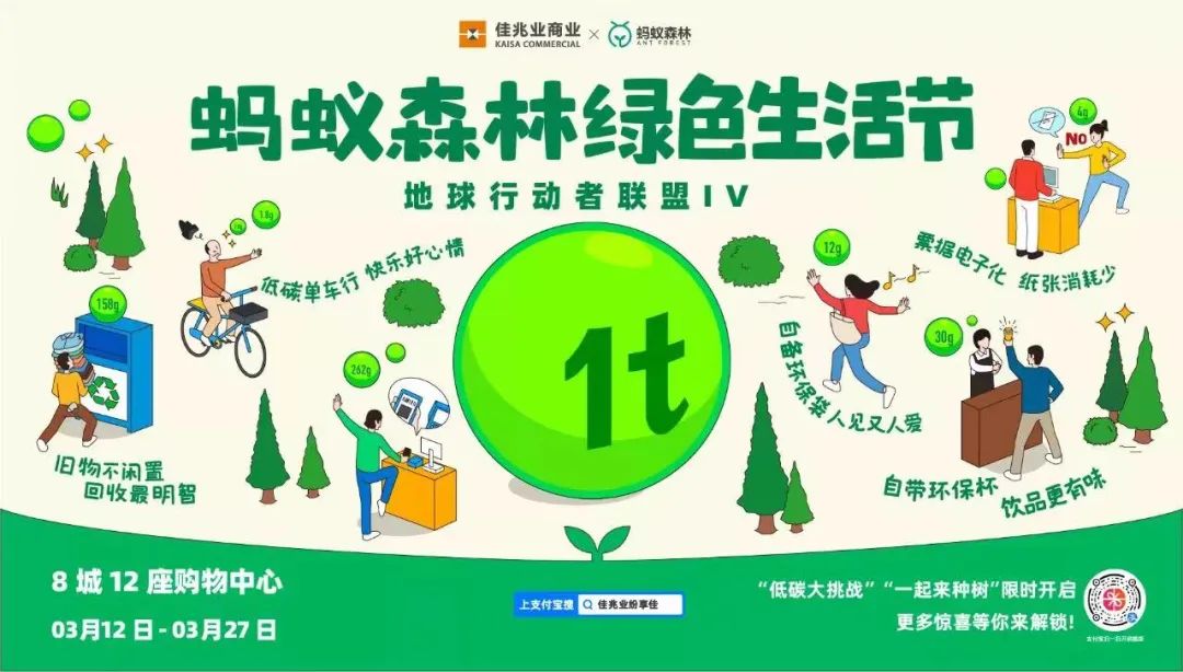 今年3月,佳兆业商业第四届地球行动者联盟与“绿色可持续共创伙伴”蚂蚁森林进行深度合作,全国8城12座购物中心举办了“蚂蚁森林绿色生活节”,通过线上线下矩阵式联动,共同倡导绿色生活理念。本次“地球行动者联盟”期间,共有近百万名纷享佳会员参与活动,小程序页面访问量环比增长359.16%,上千人在低碳大挑战活动中进行绿色打卡,为数字化助推公益提供了范本。佳兆业商业有效借助线上渠道,增强体验性、互动性,为用户提供参与绿色生活的动力,助推数字化公益事业发展,令公益与商业的邂逅来得多姿多彩,展现出购物中心数字化能力运用的更多可能。
