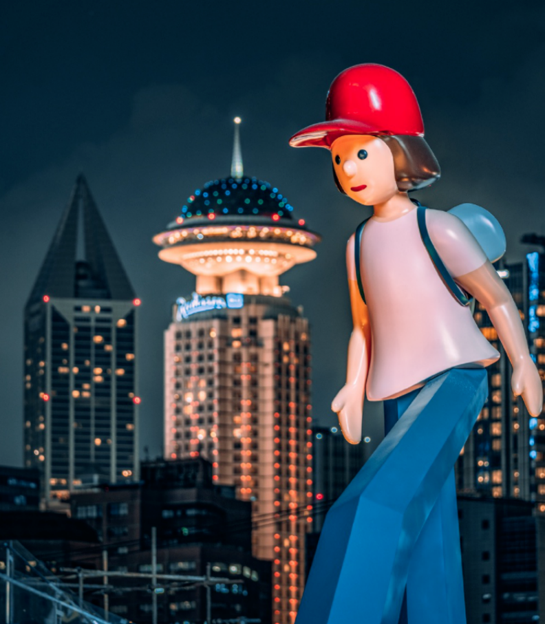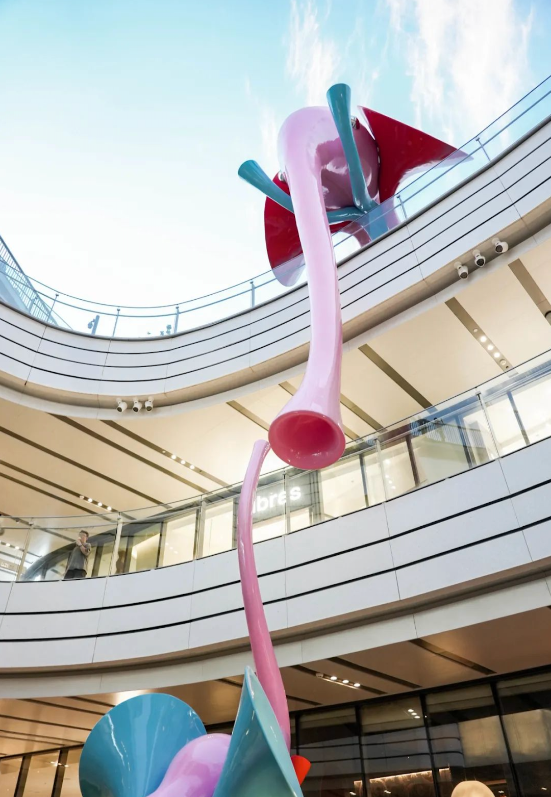 由创意品牌AllRightsReserved和艺术团体Inges Idee联合打造的大型户外永久艺术装置——“迈上!”和“大象亲子乐园”,两件装置分别位于苏河湾万象天地东里中庭和西里中庭,纵横跨越两层商业空间。
