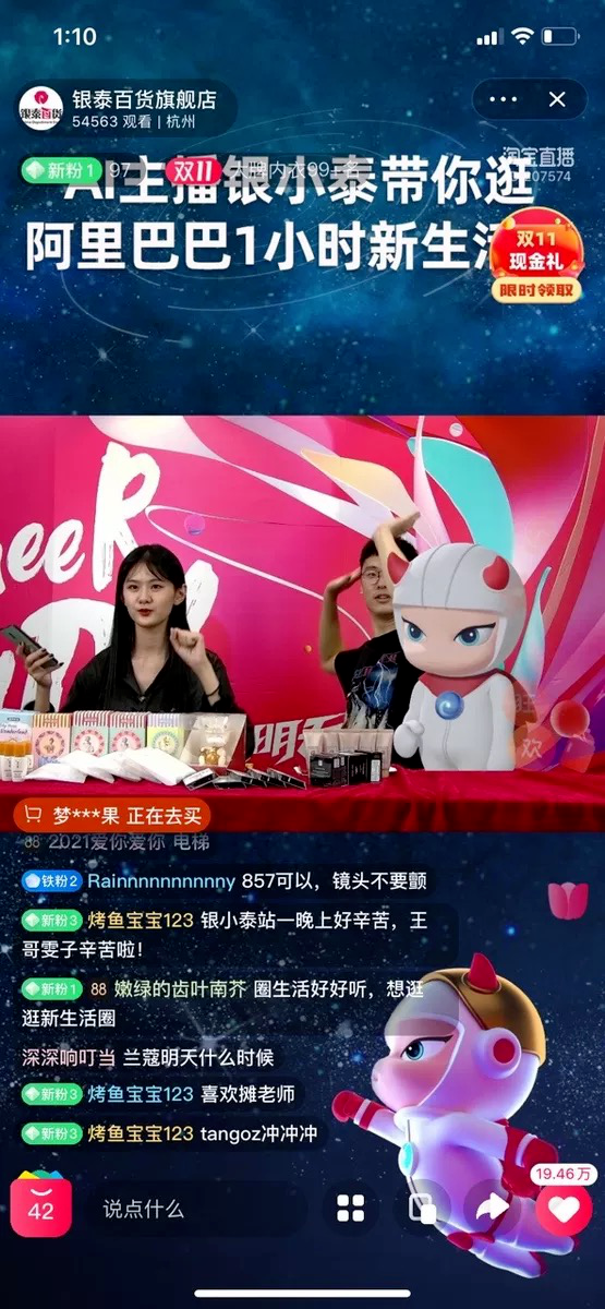杭州银泰百货于2020年打造商业地产领域首款AI虚拟主播“银小泰”,在双十一期间正式出道进行跨夜直播带货,通过5G、面部捕捉、实时渲染等技术,与粉丝进行实时的互动。