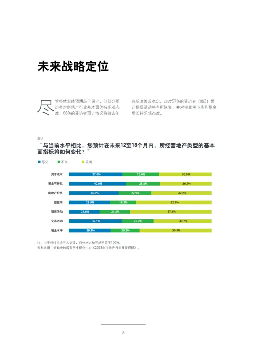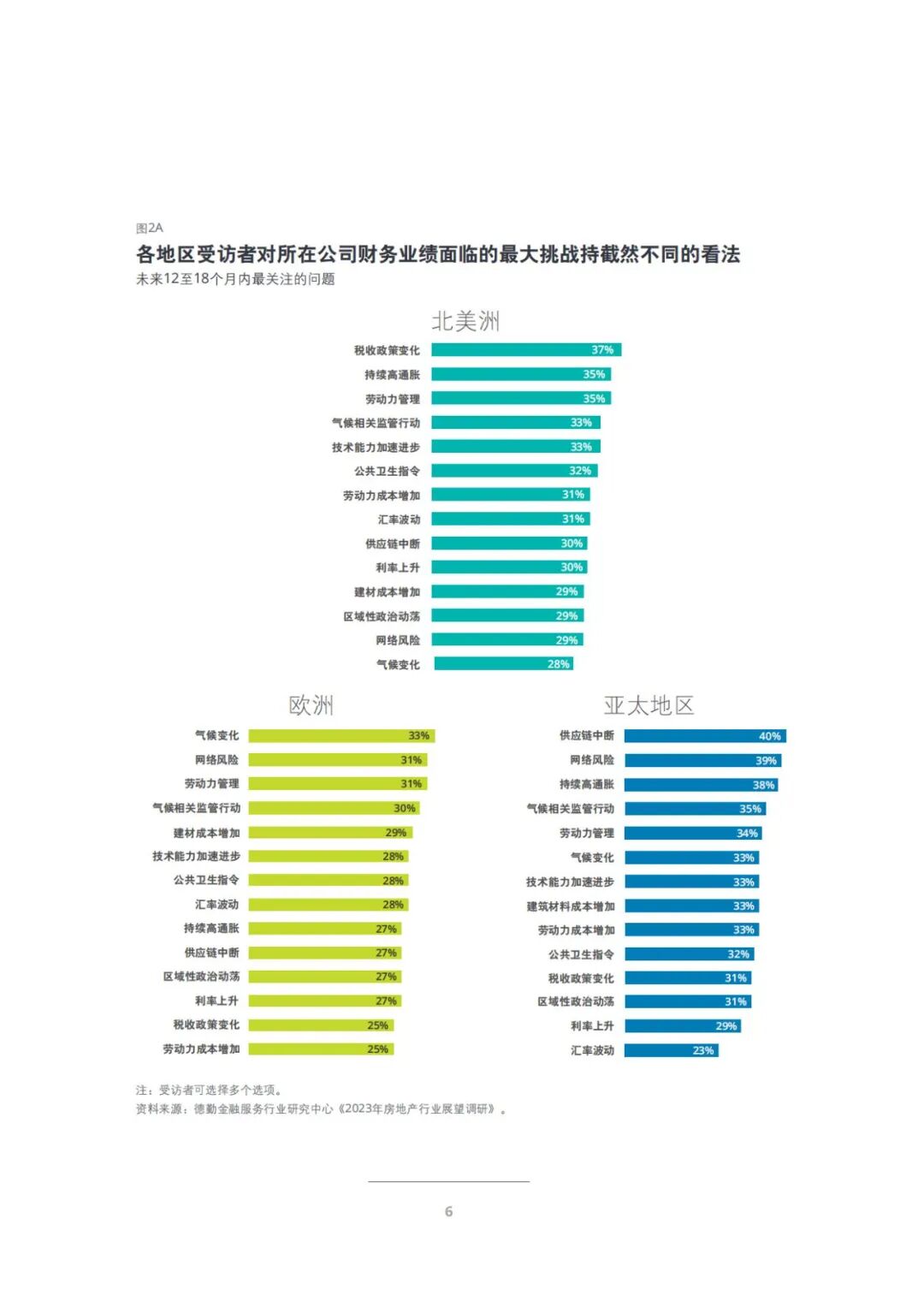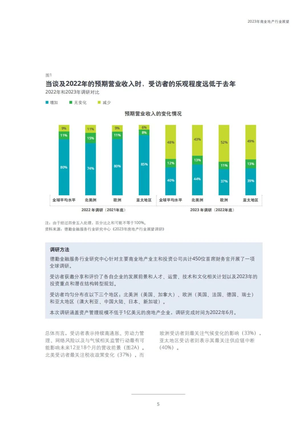 德勤6日发布《2023年商业地产行业展望》报告表示,伴随疫情等原因引发的市场调整,全球商业地产行业面临不确定性,受访房地产领域企业首席财务官对明年运营计划持更加审慎态度。