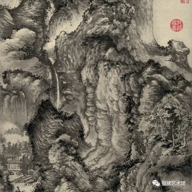 此图绘千岩万壑,峰峦曲折,山势峥嵘,气势雄伟秀拔,意境深邃,构图繁复。
