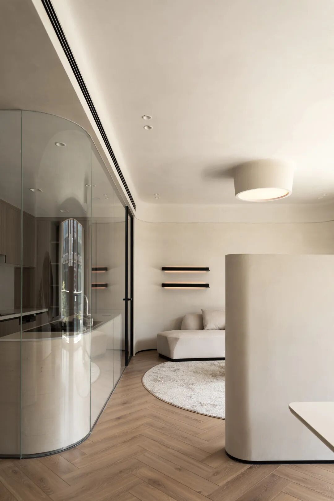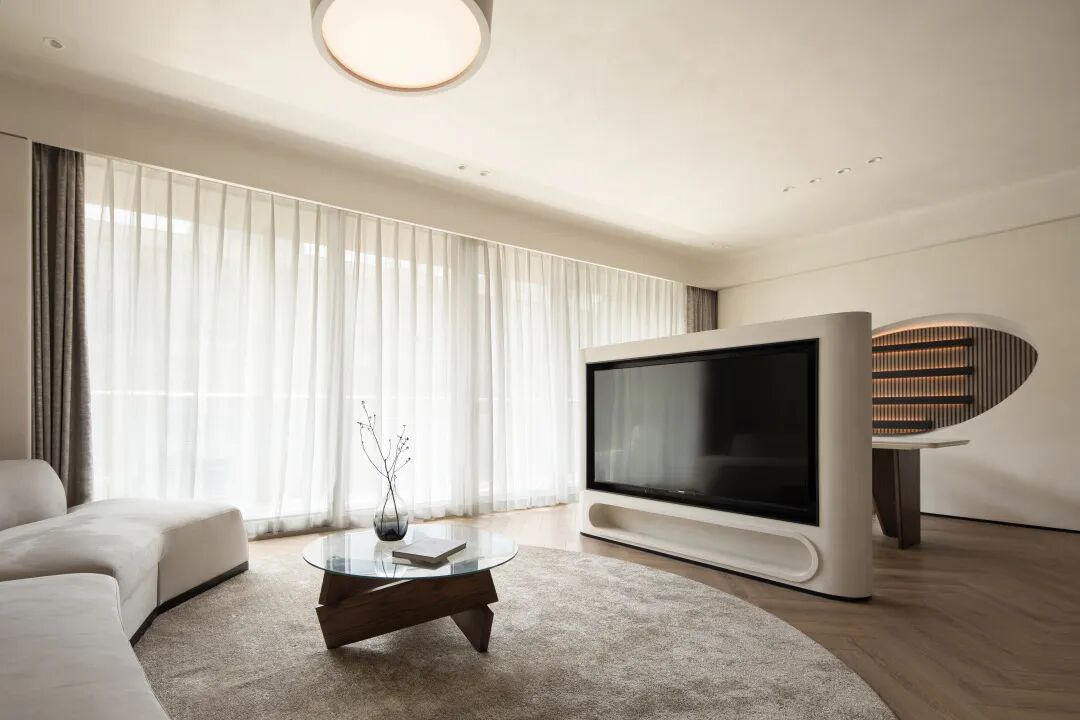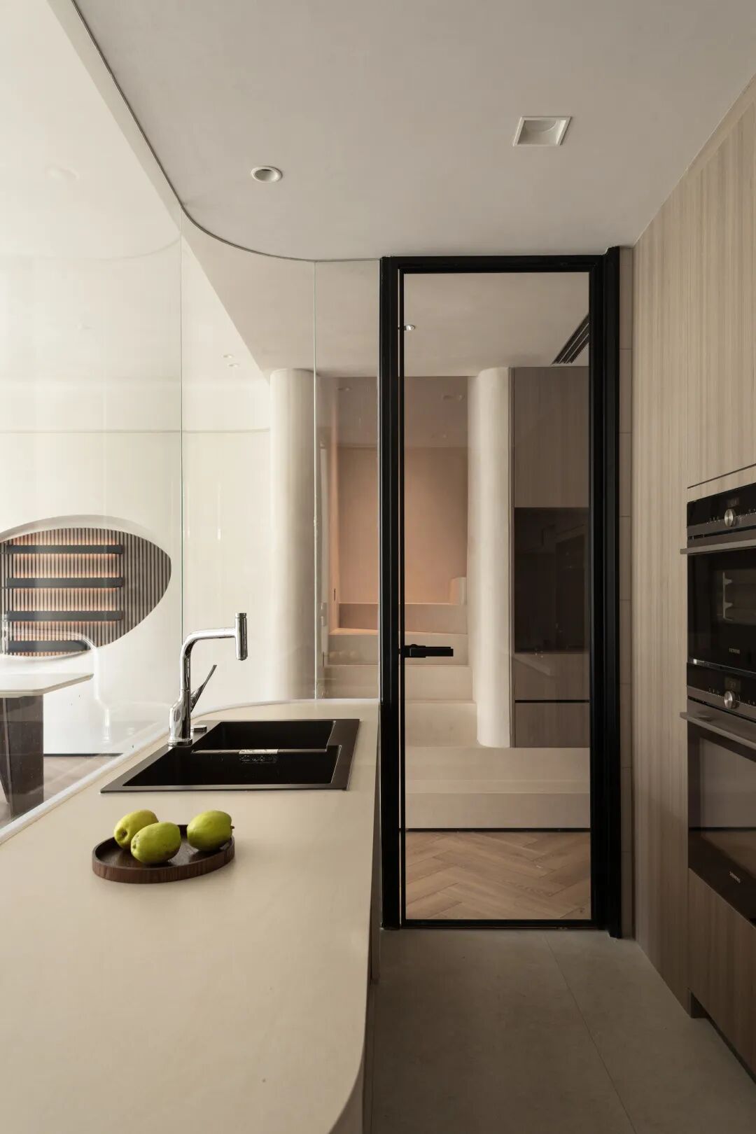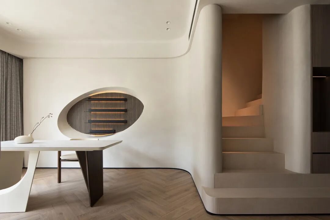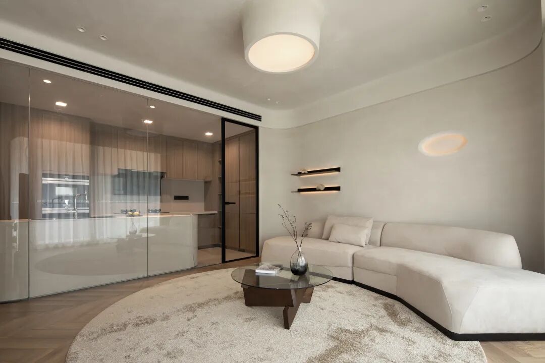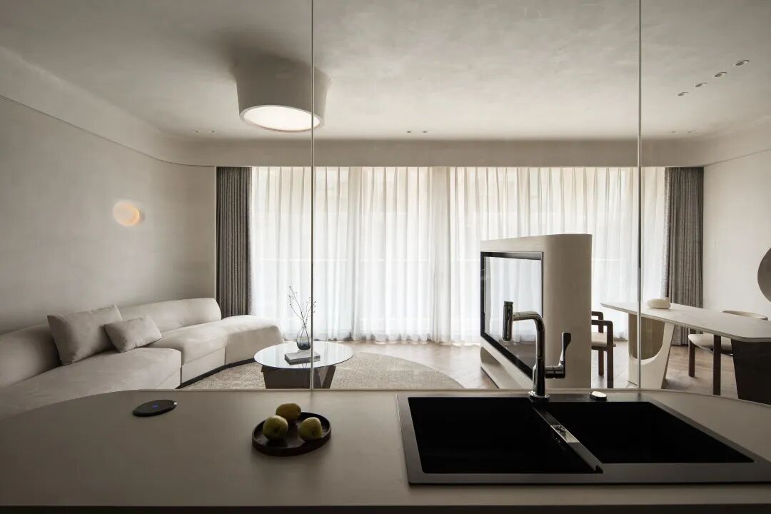 共用同一空间 构建连通性。厨房与会客区之间运用曲面玻璃,在设计中弱化了空间中的线面穿插感。