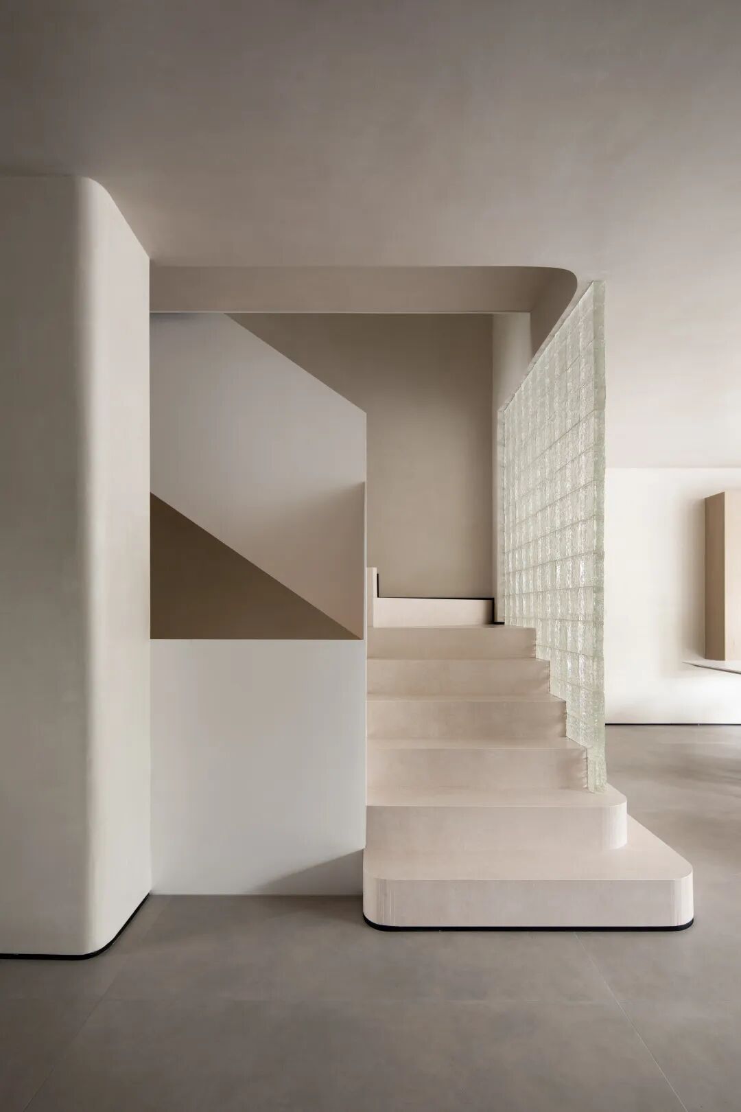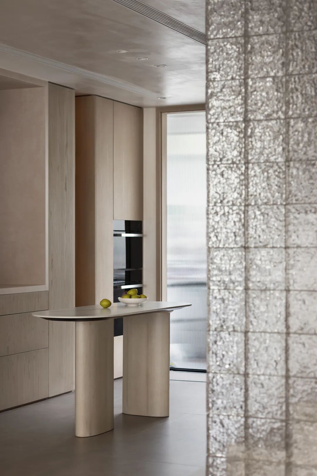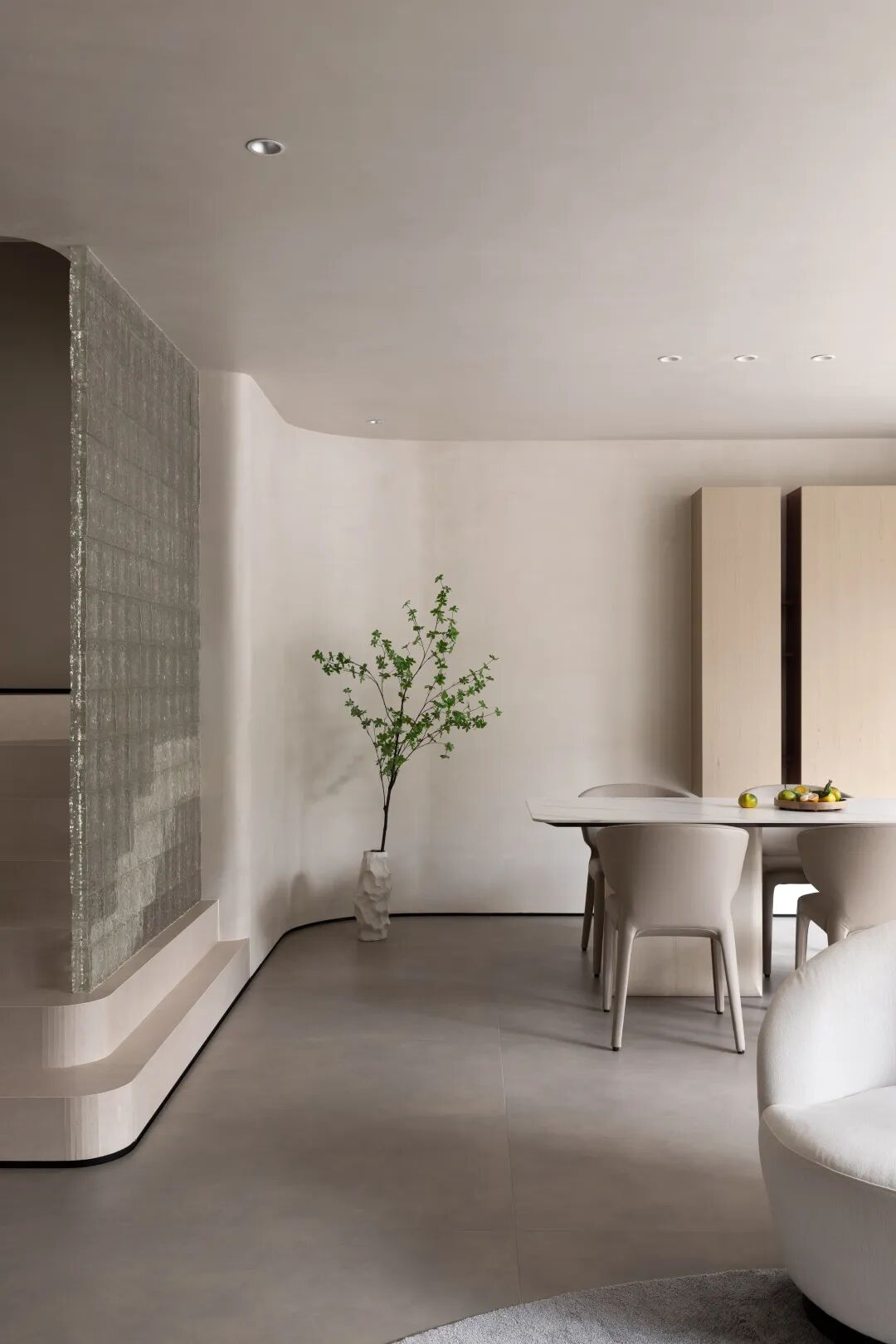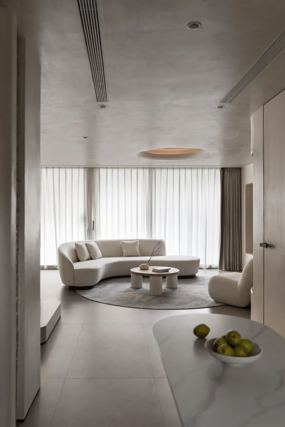 共用同一空间 构建连通性。厨房与会客区之间运用曲面玻璃,在设计中弱化了空间中的线面穿插感。