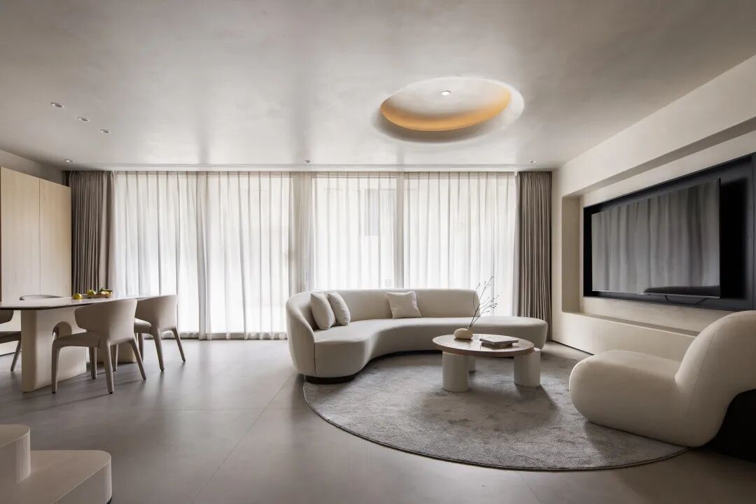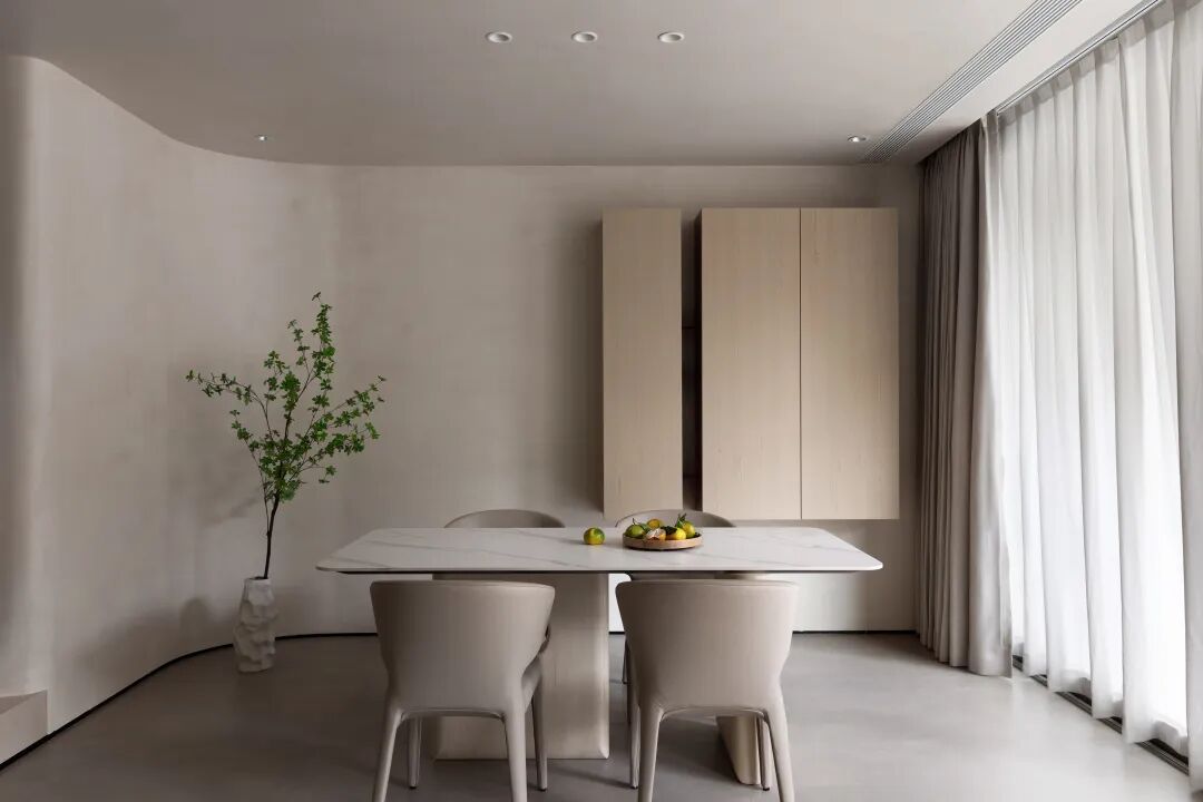 大面积留白墙面,挑高的天花板,纱质窗帘在徐徐飘动,在朴实雅致的氛围下尤显宁静安然,营造至简的美感。