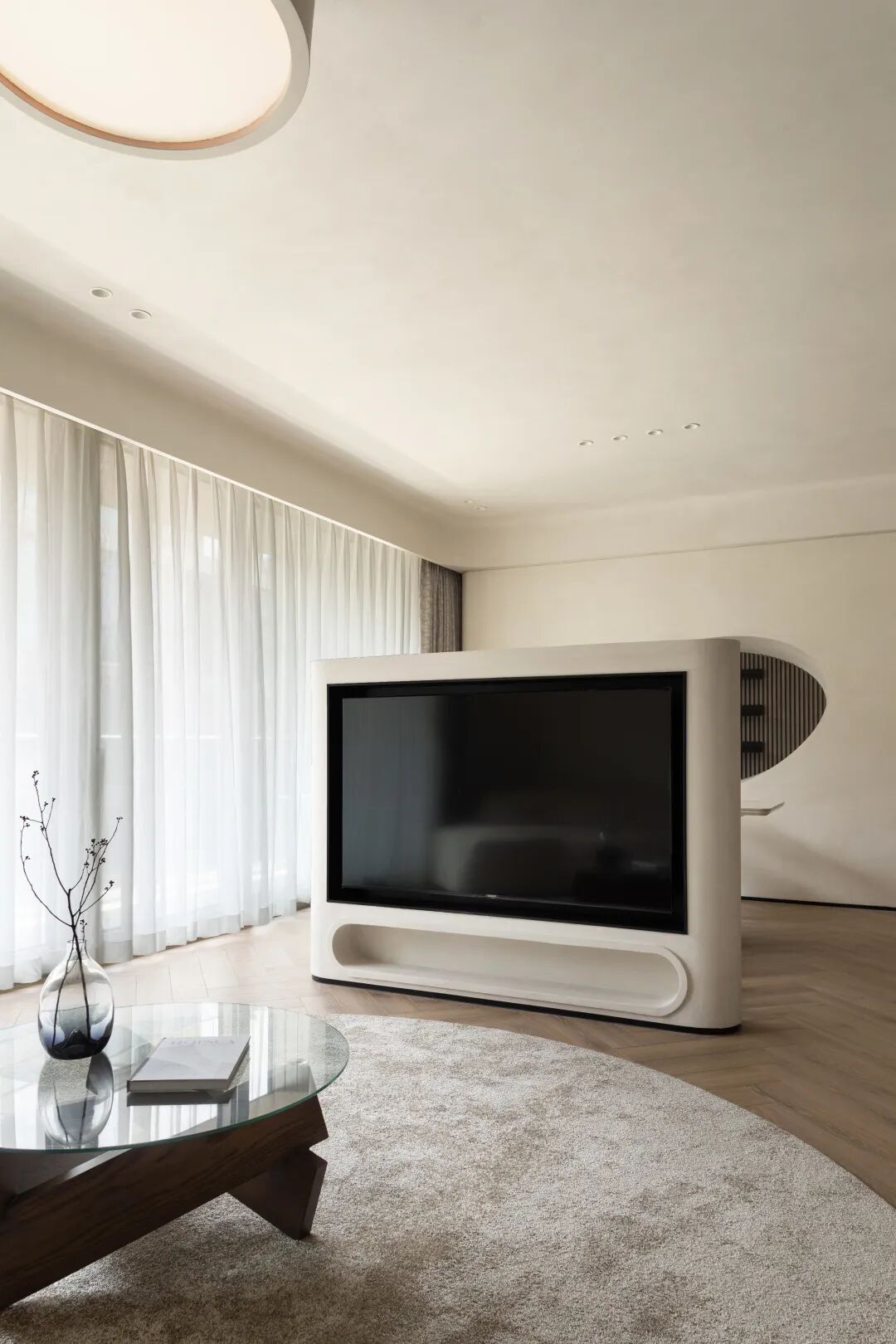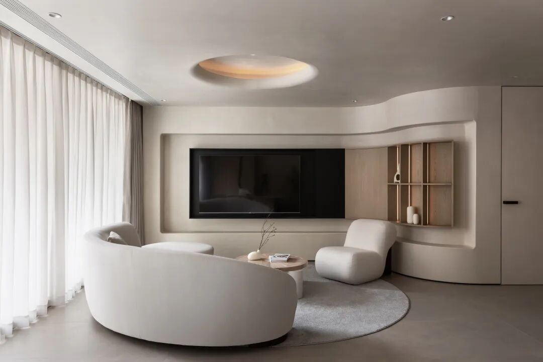 会客区整体用大地色作为基础色调,放置弧形沙发,半弧形电视格栅,曲线蔓延,柔和了整个空间。