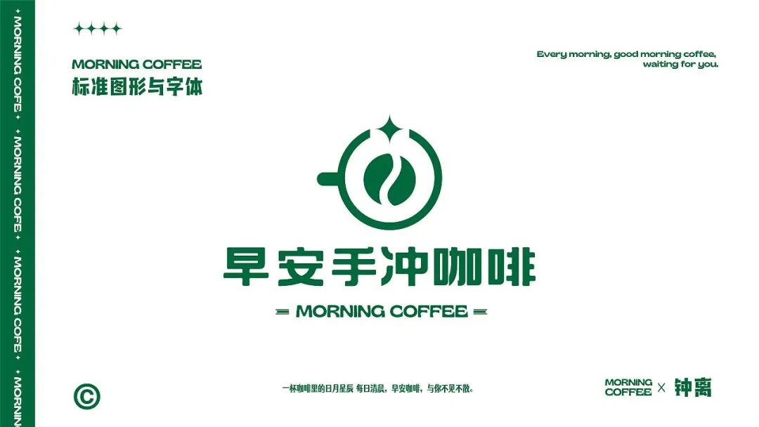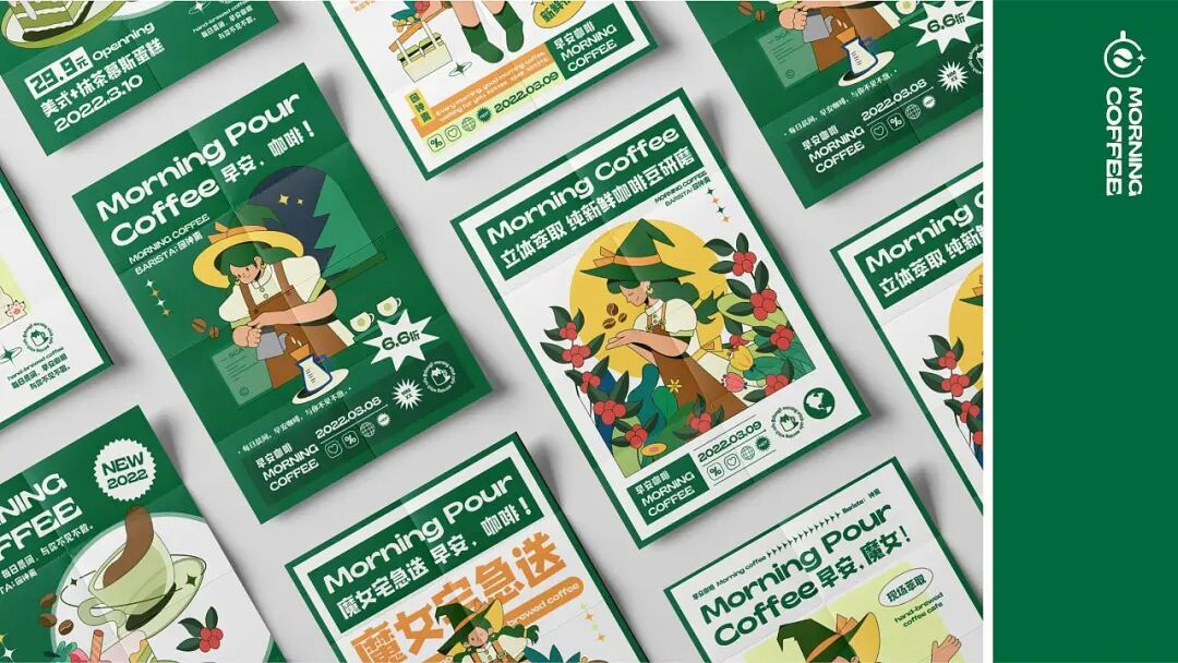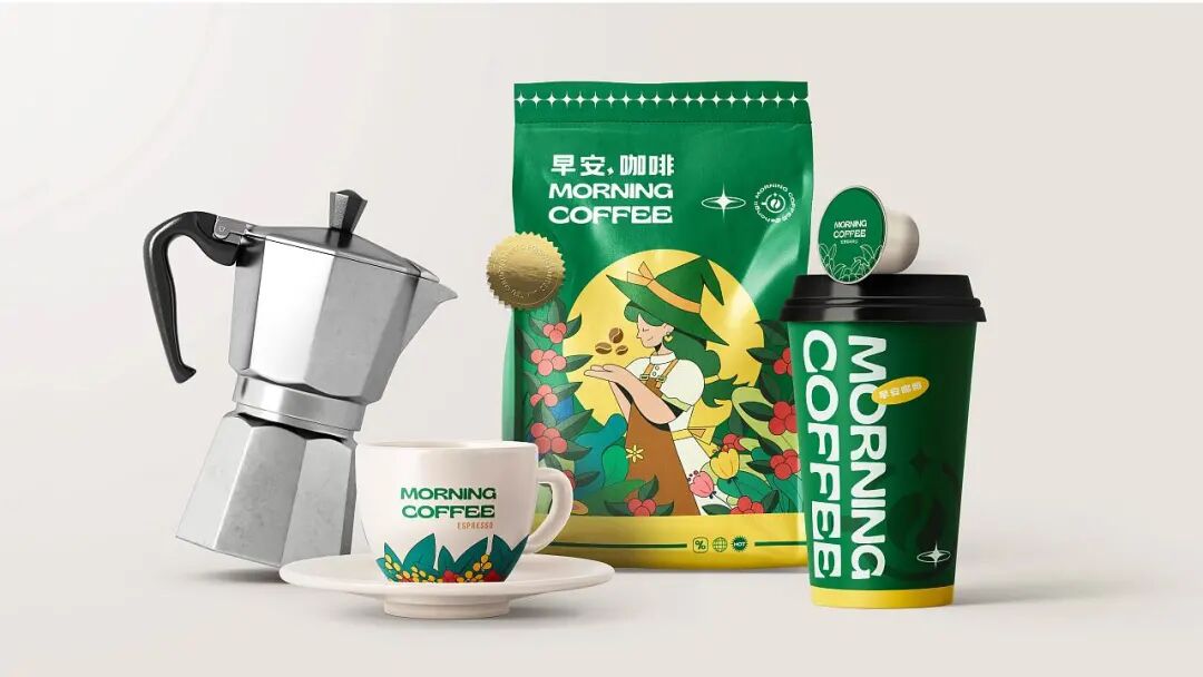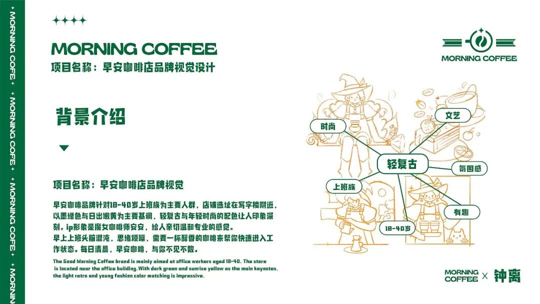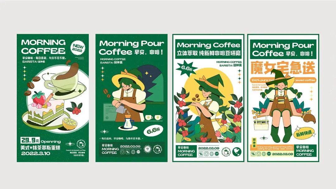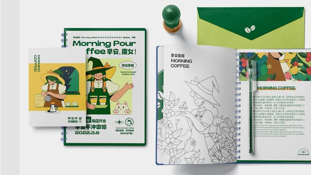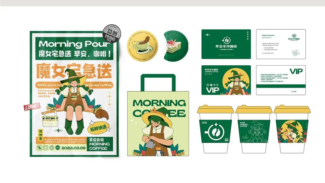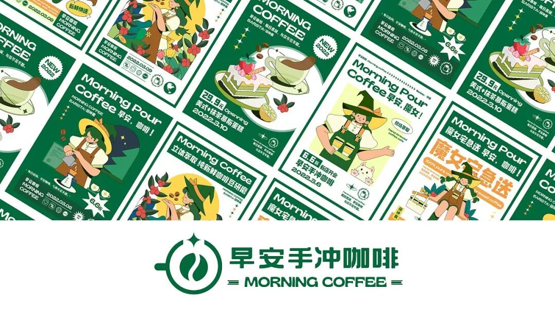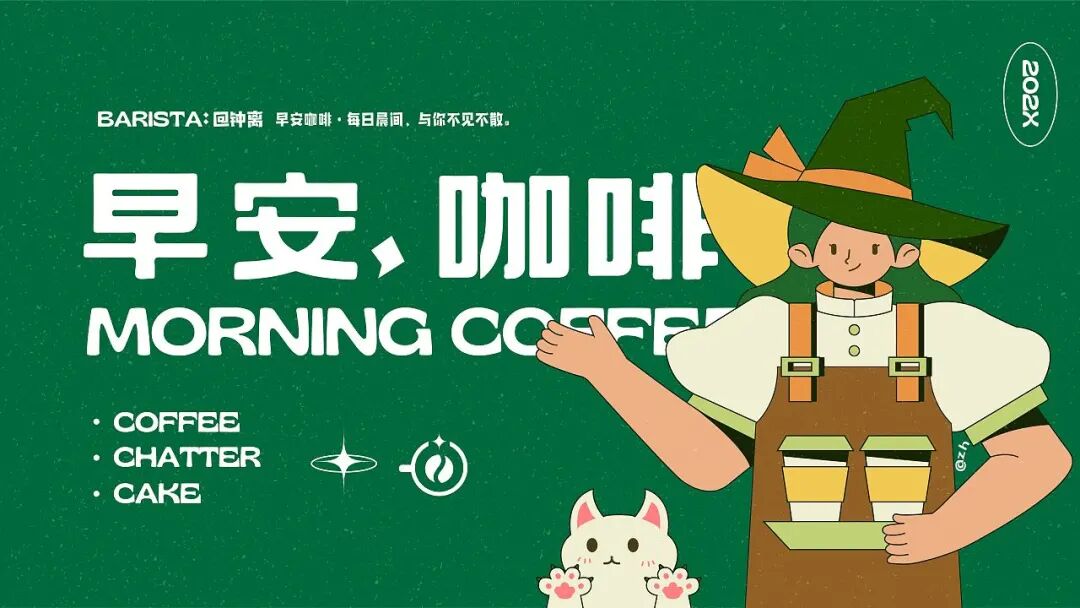 【早安咖啡】,以此为品名,用意是让每个工作日昏沉的上午,都能让目标用户们联想起“早安咖啡”。整体以墨绿色与日出嫩黄为主色调,轻复古与年轻时尚的配色让人更加印象深刻。其中IP人物--魔女咖啡师安安,给人亲切、温和而又专业的感觉。