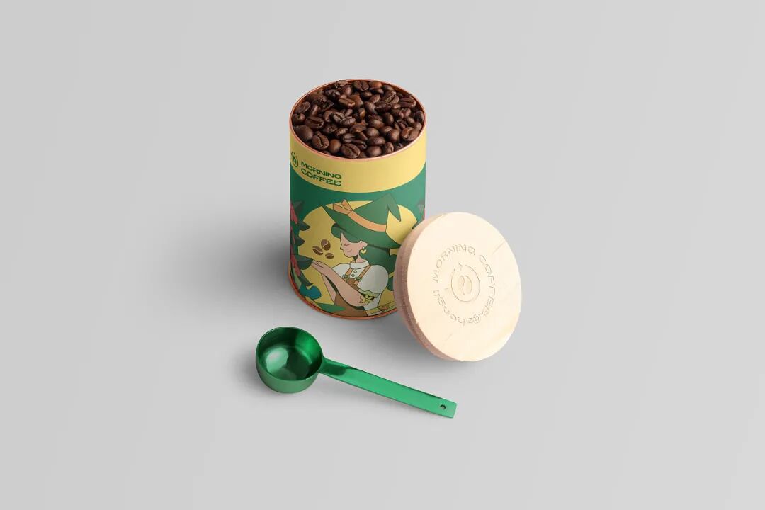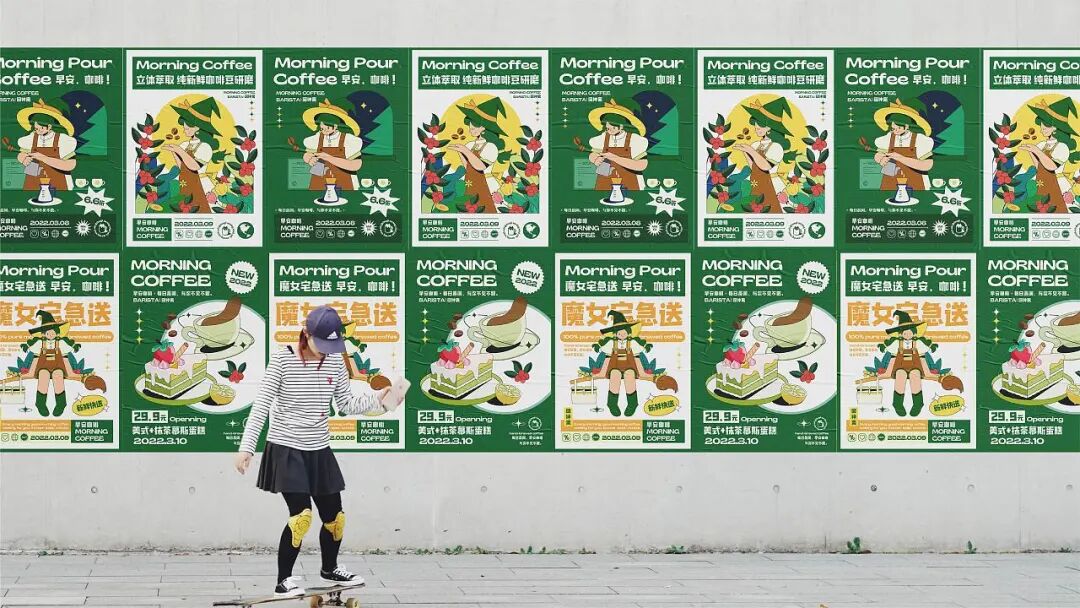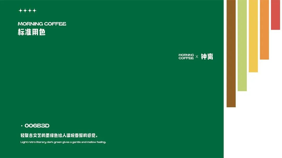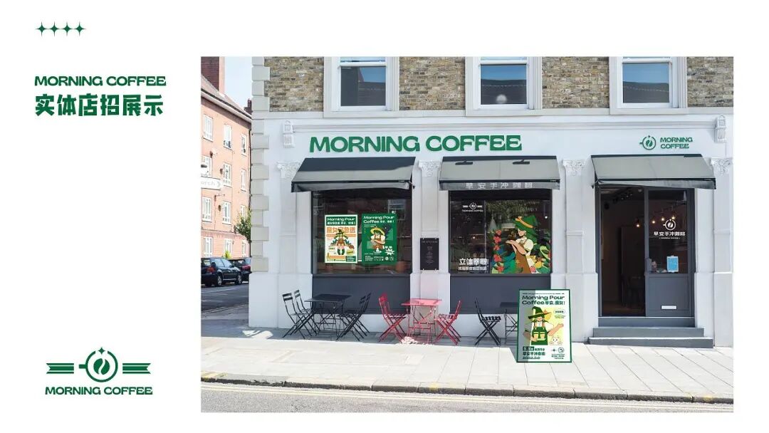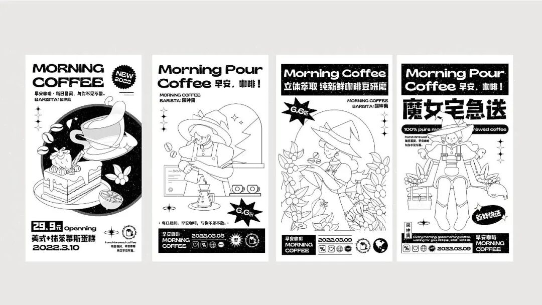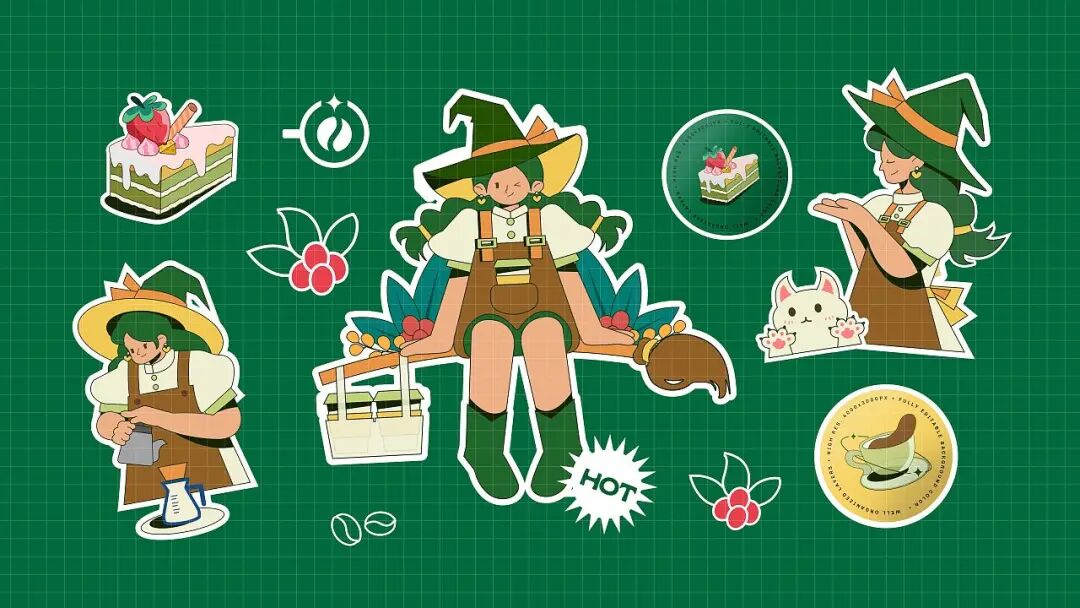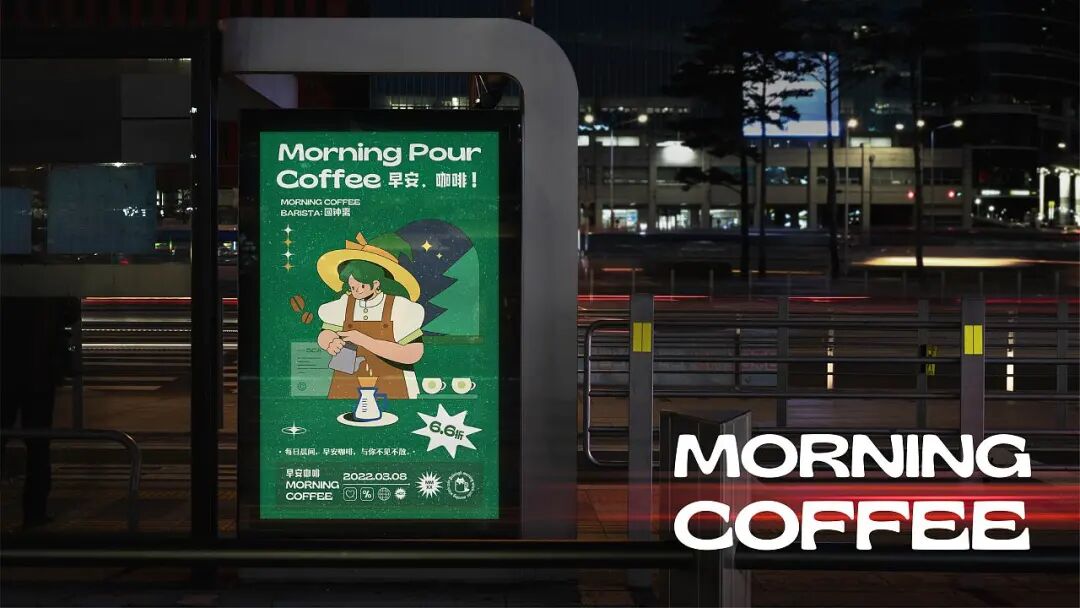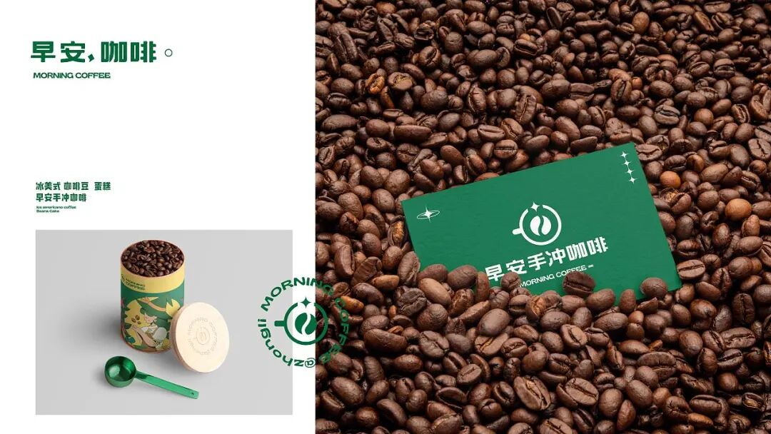 【早安咖啡】,以此为品名,用意是让每个工作日昏沉的上午,都能让目标用户们联想起“早安咖啡”。整体以墨绿色与日出嫩黄为主色调,轻复古与年轻时尚的配色让人更加印象深刻。其中IP人物--魔女咖啡师安安,给人亲切、温和而又专业的感觉。