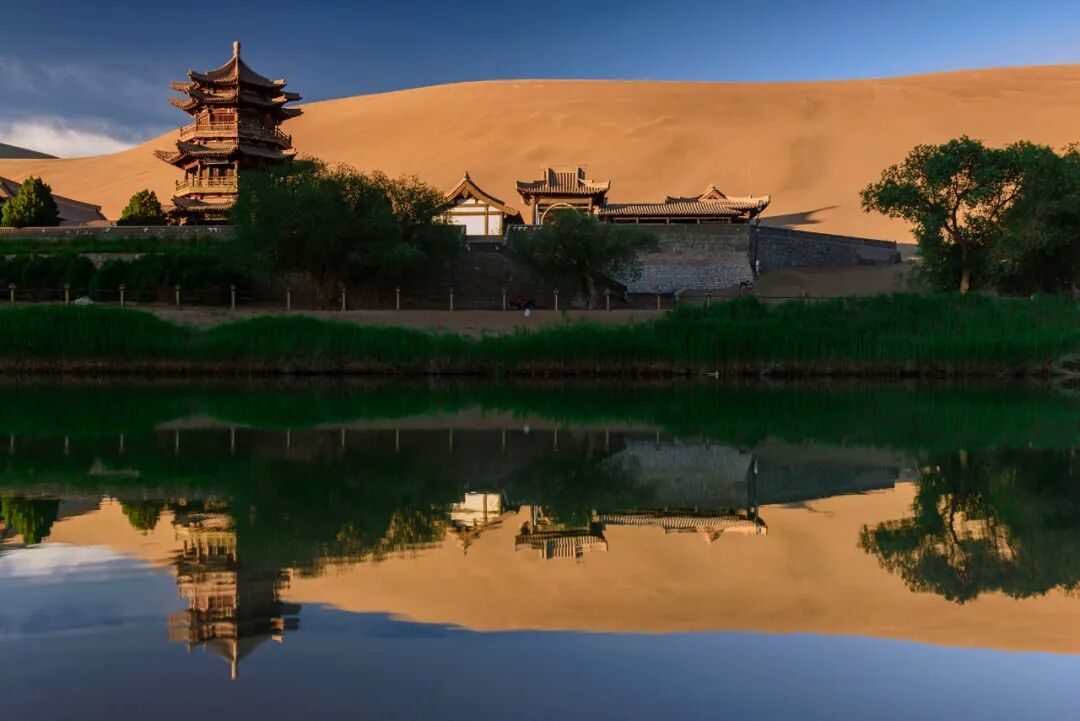 月牙泉四周为黄沙环绕,其中西南侧、北侧各有两座较高的沙丘。