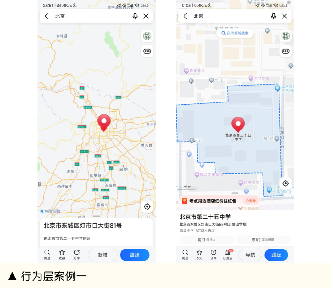 行为层设计案例一:高德地图当你点开地图区时他会根据你GPS定位你所在城市,如果想去了解附近地区时,可以放大地图采用内容分类的方式展示出周边区域,如果想了解指定位置时,可点开指定位置,地图通过多层级的信息划分,展示不同颗粒度的内容。