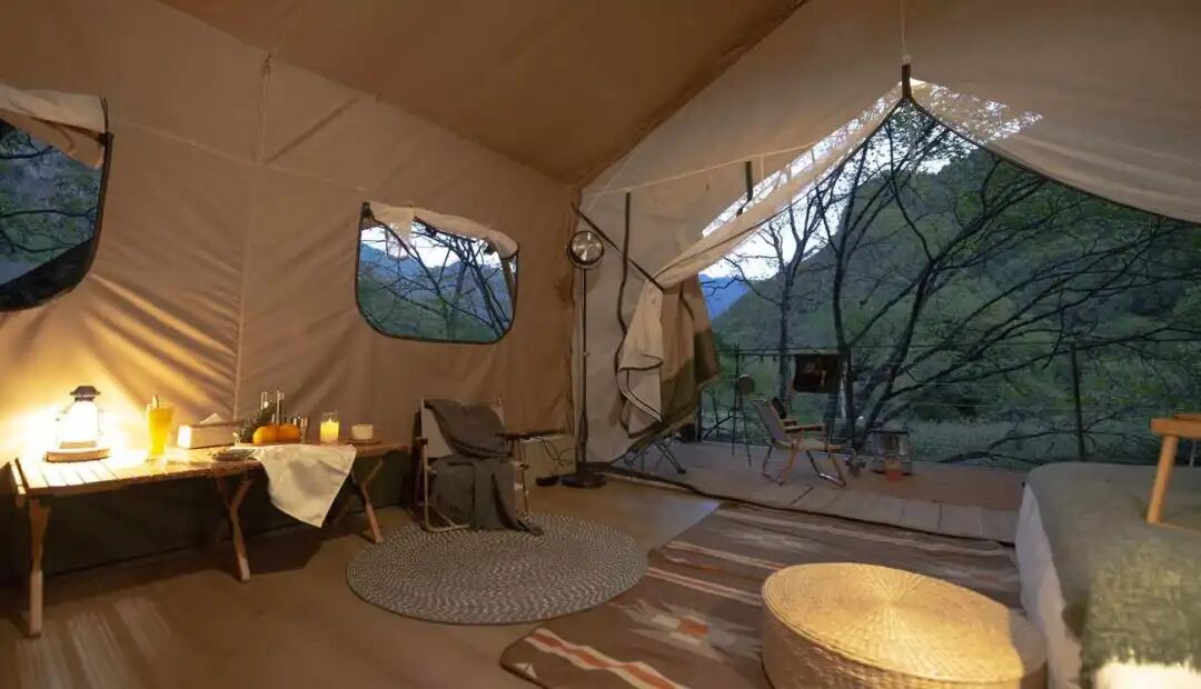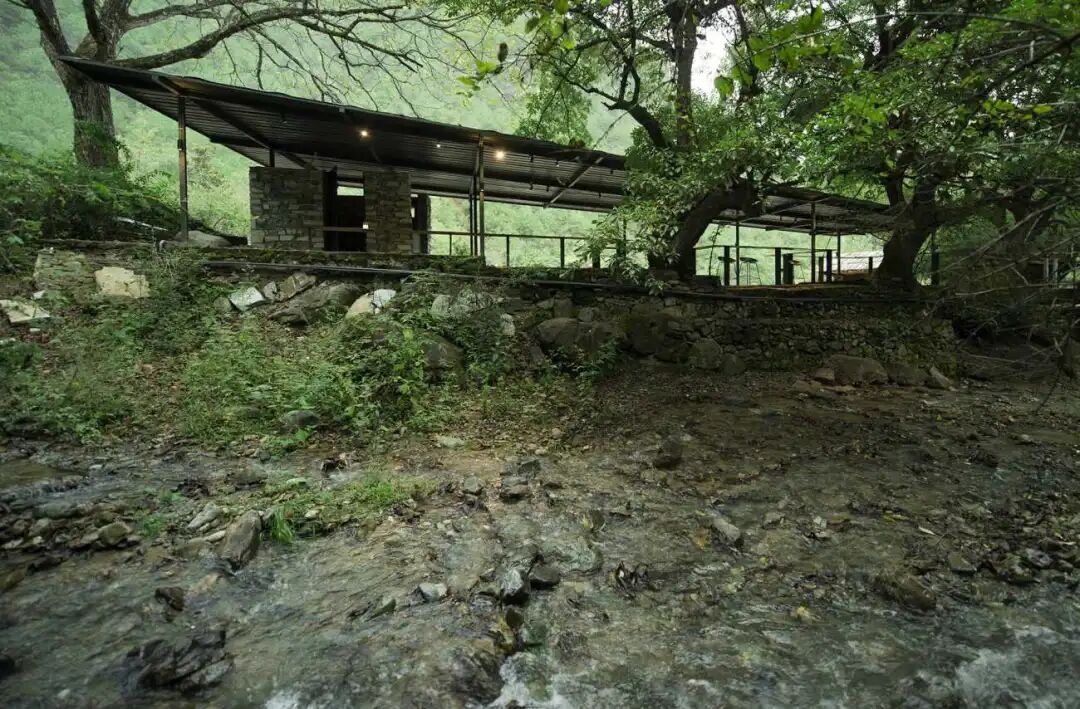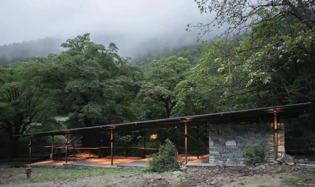 委托方希望在国家公园入口处的场地建设帐篷营地,并设置满足休闲住宿的服务设施,供人亲近自然,留宿林间;建筑师的设计策略是最小限度的干预自然,将可收起的住宿帐篷依势错落,临溪布局,以求各自观溪,枕水而眠;与此同时,建筑师以极为克制的设计手法,仅新筑两处方亭,以满足必要的接待和餐饮需求。