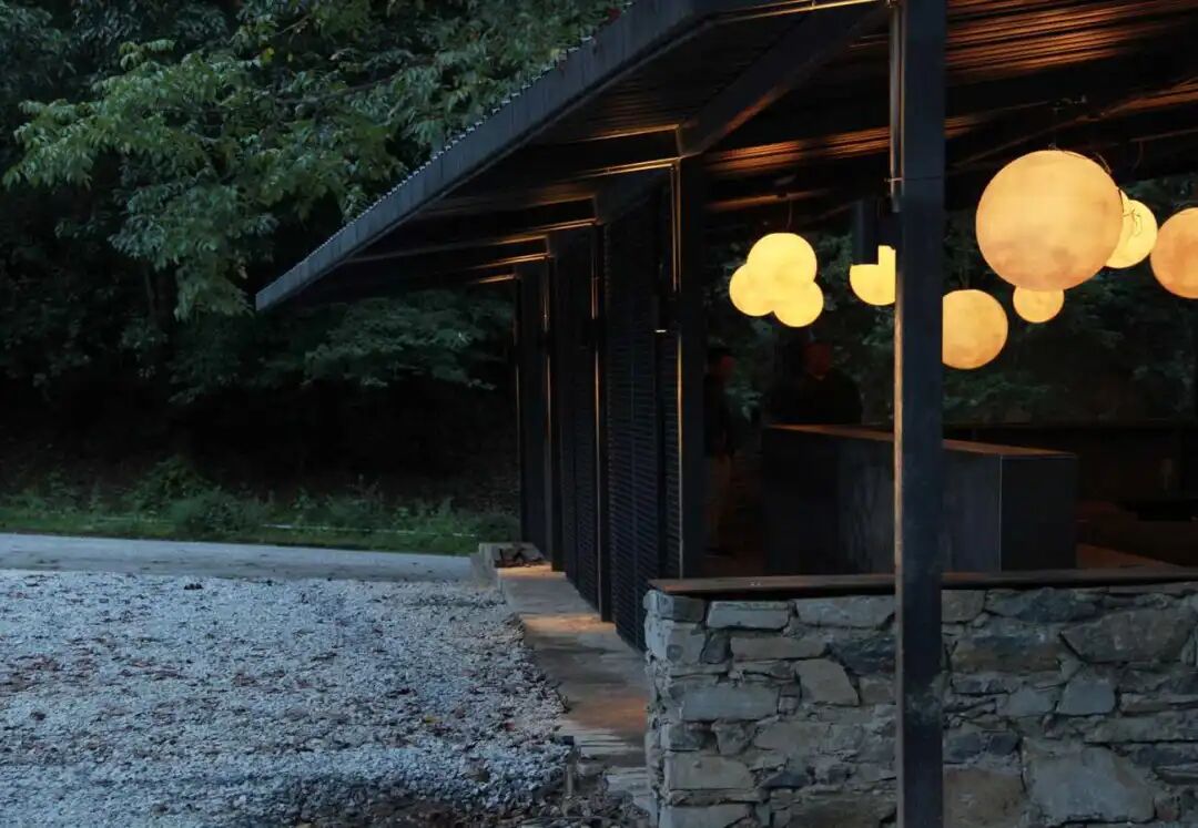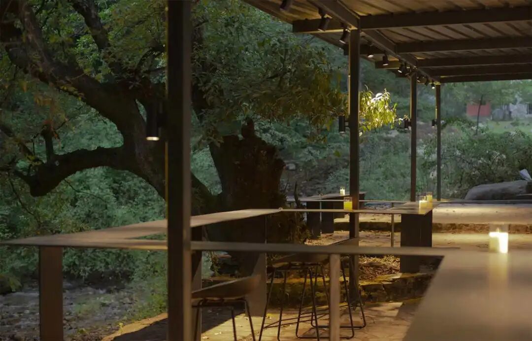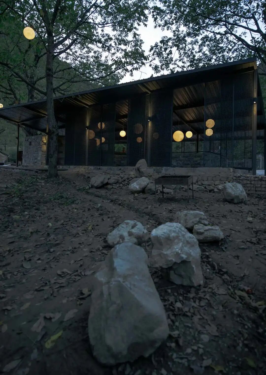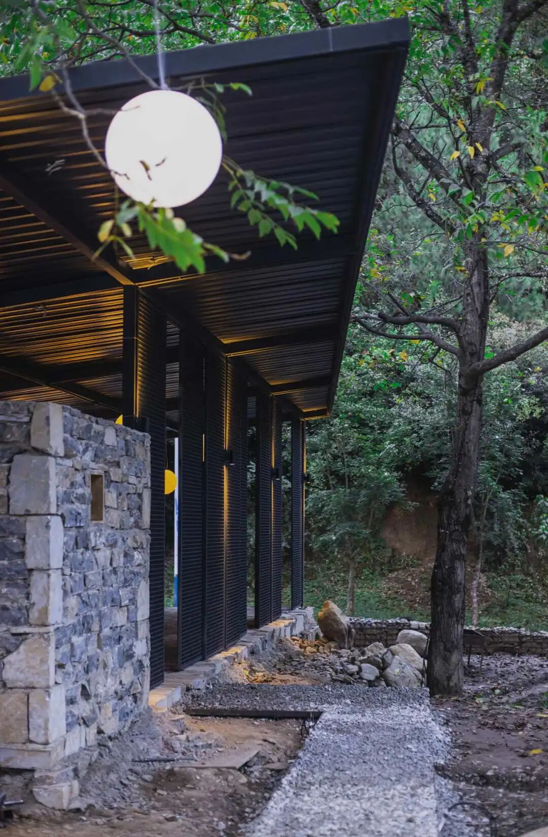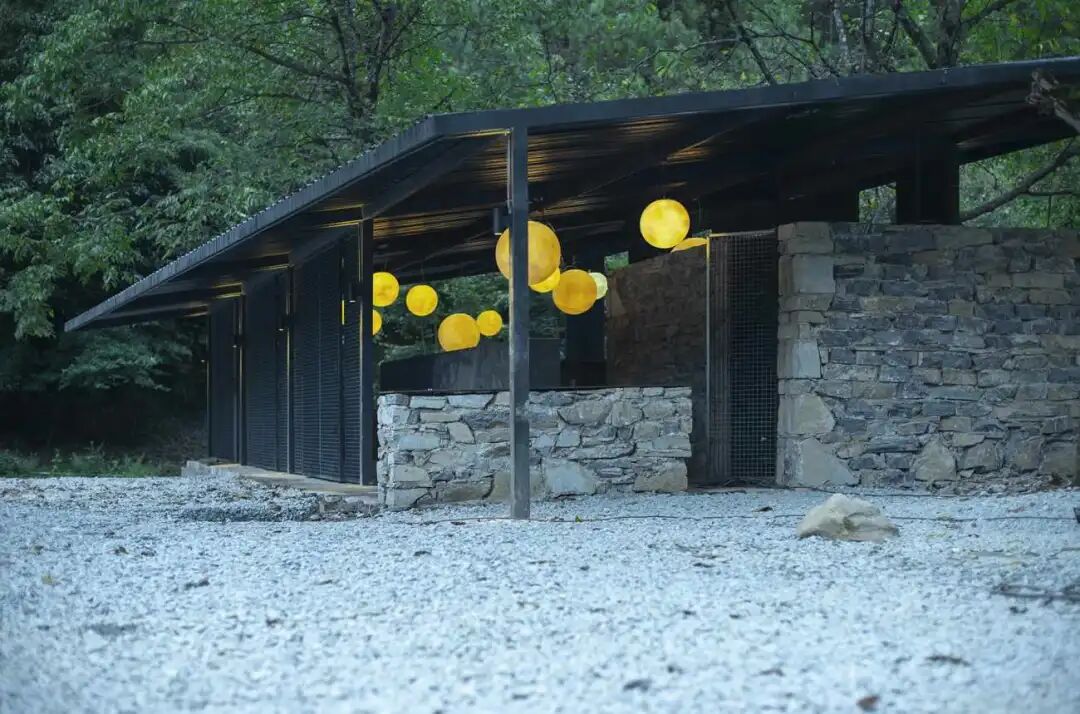 Woodland Pavilion was constructed out of light-steel structure painted in dark colors, appearing slender and clean. The long table and walls are built out of locally sourced stones from the park, exuding a rustic charm.