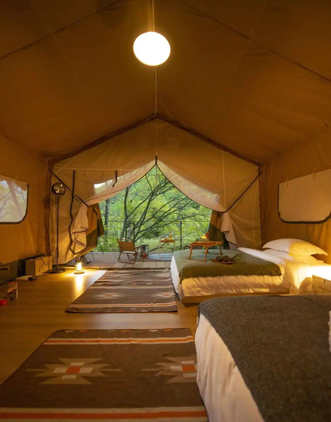 Adjacent to the road, Woodland Pavilion serves as the campsite’s reception area. United under a single shed roof, the architect compacted the front desk, lounge, storage, and other functions into an interconnected whole. A long, custom-crafted table flows and twists through its space, allowing activities to unfold around it – all the while keeping a variety of other layout options available for change.