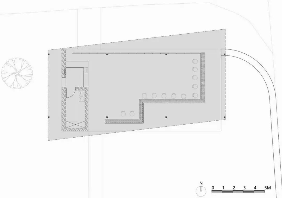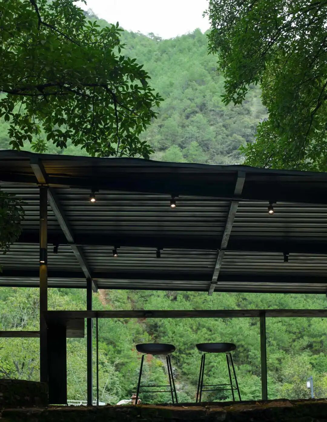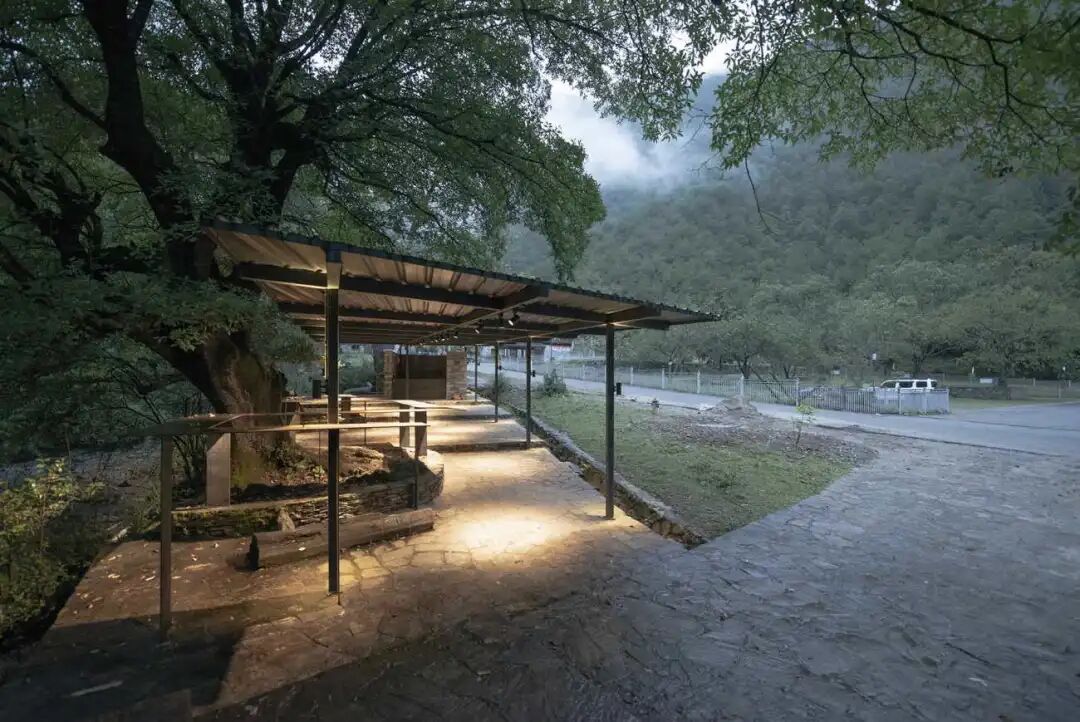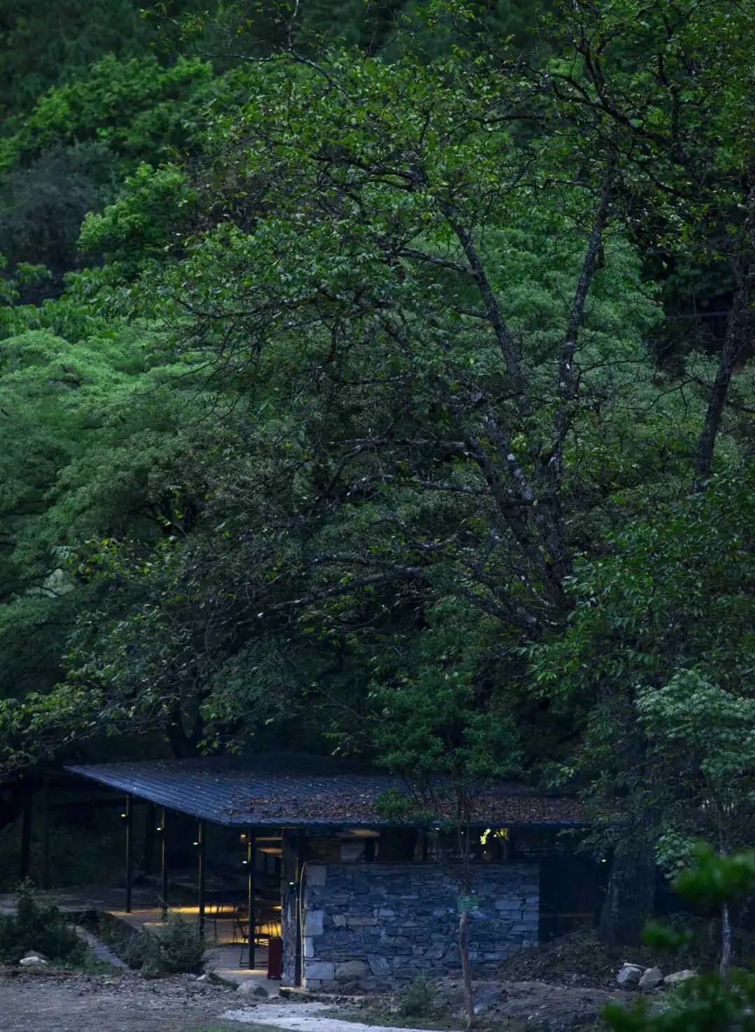 溪边亭同样采用纤细的钢结构建造,屋顶轮廓呼应原有石台,新建的操作服务空间墙体也由周边天然石材砌筑,与石台融为一体。