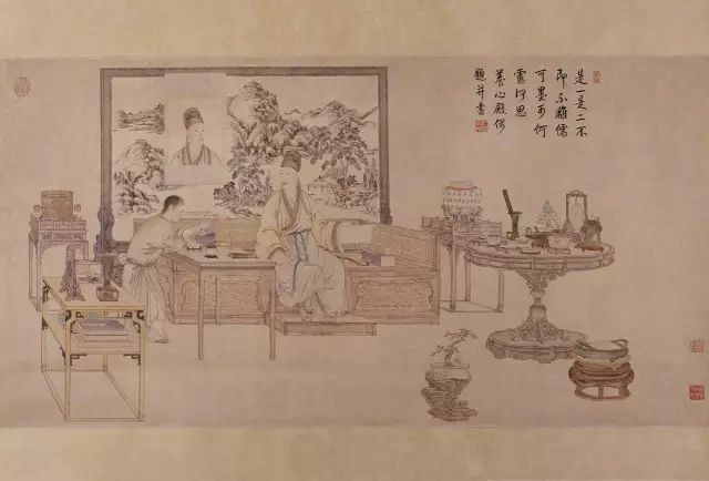 明·仇英《临宋人画轴》 中完整展现了文人书房的布置,其中不乏各类清供,当时古人对于生活之细致考究可见一斑。