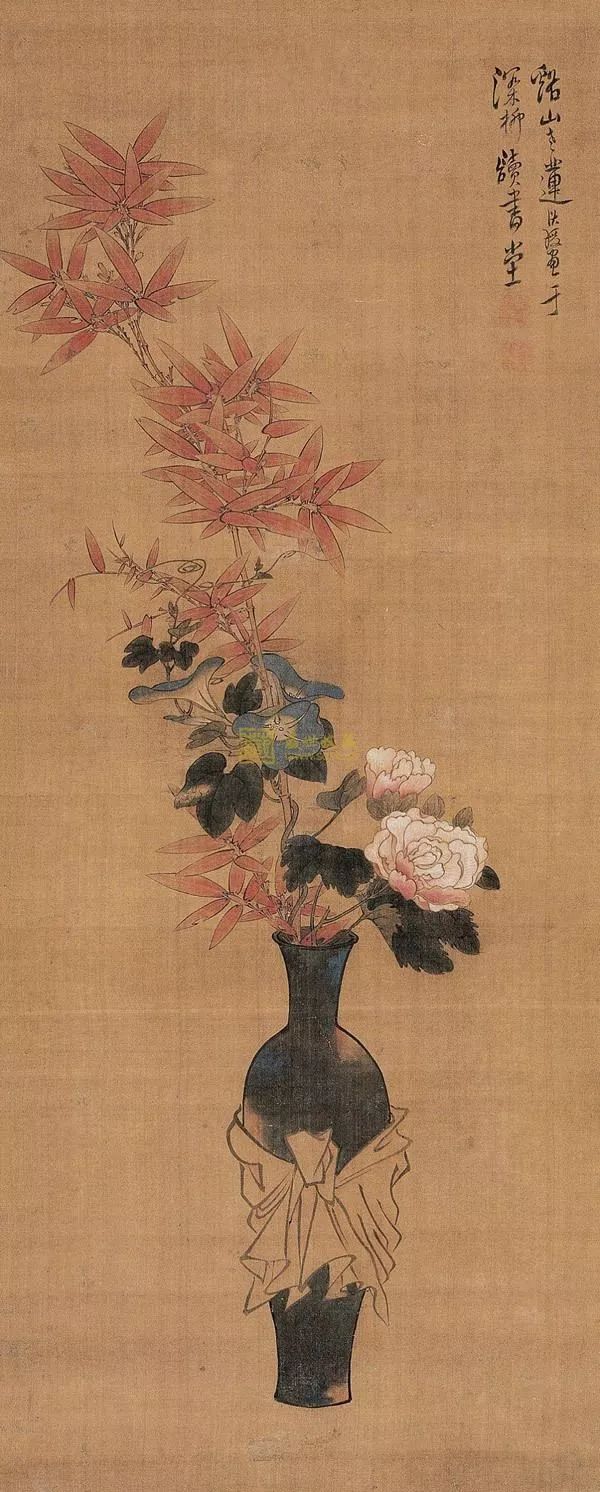 金廷标《仕女簪花图》中出现盆景/插花/香炉/如意等众多清供
