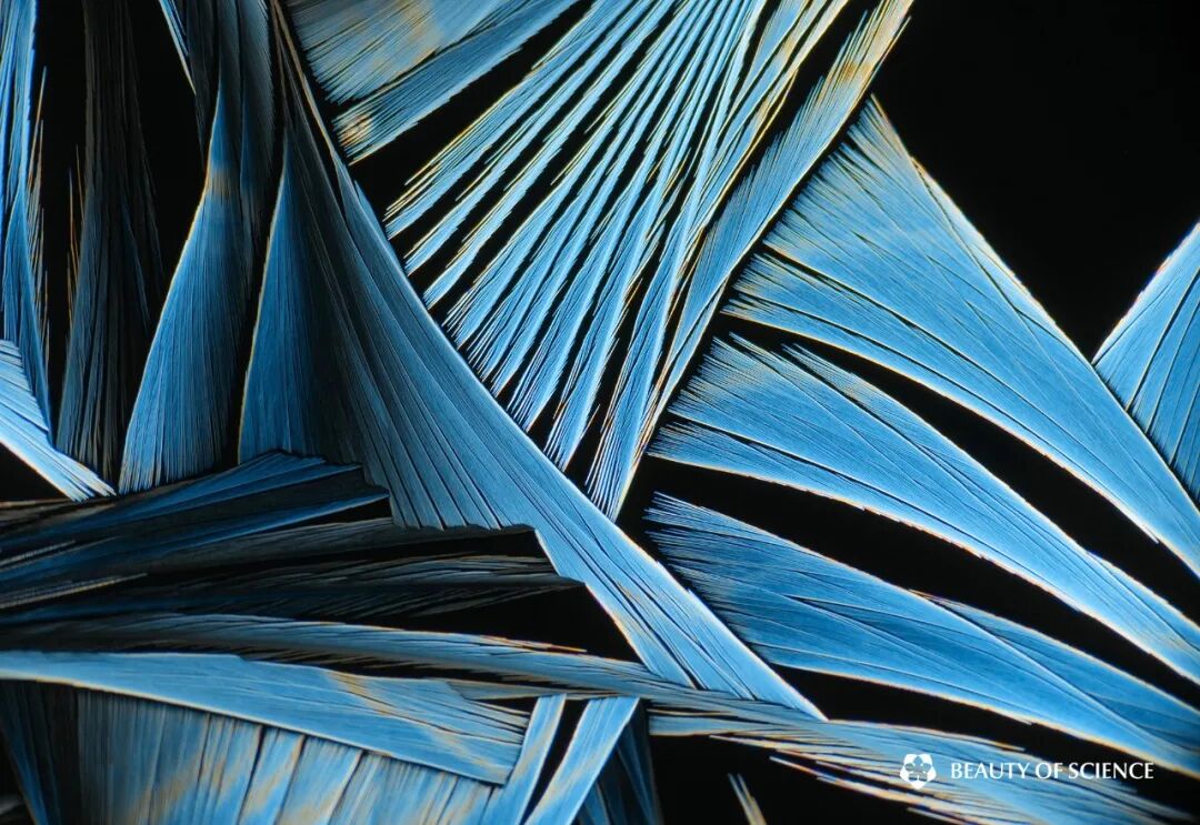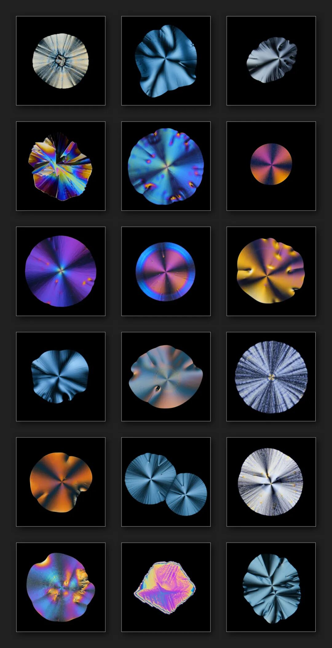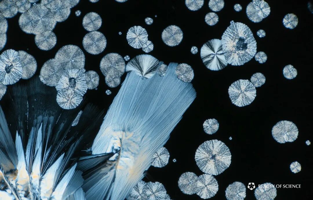 在偏振光的作用下,结晶过程愈发迷人——色彩被唤醒,晶体仿佛拥有生命,逗弄着光,朴素瑰丽的色彩在深暗中绽放与闪耀,描绘出一处处奇妙的生命之原。