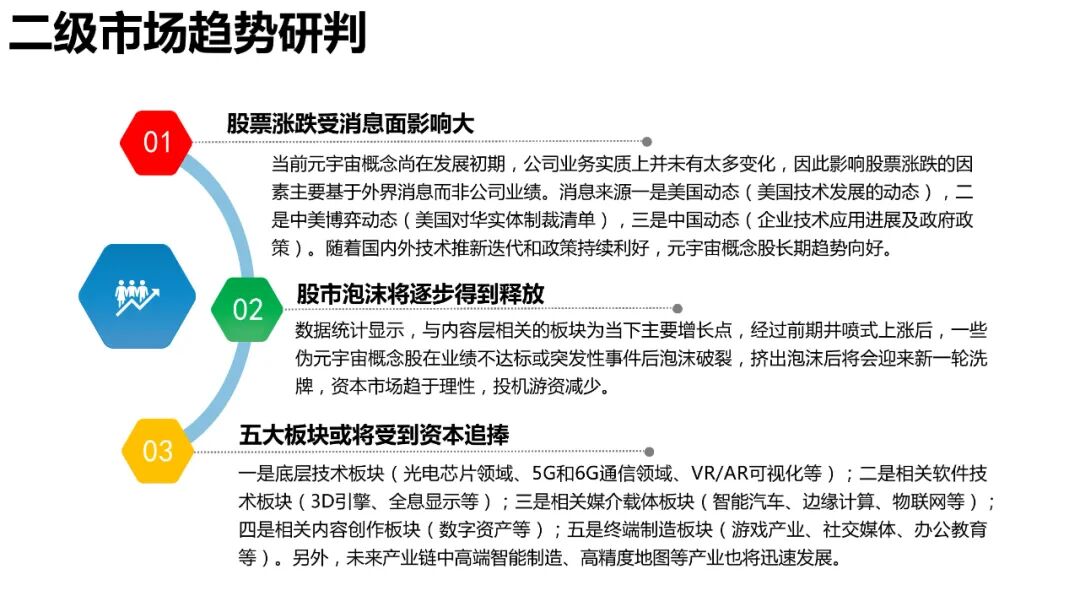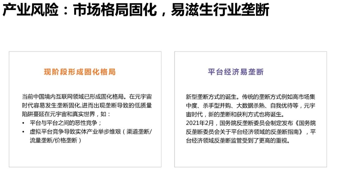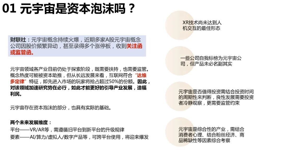 元宇宙领域各产业目前仍处于探索阶段,既需要扶持,也需要监管。概念热度可能被资本助推,但从长远发展来看,互联网符合“达维多定律”特征,即先进入市场的玩家将抢占超过50%的份额。因此,对该领域加速研究势在必行,如此才能更好的引导产业发展,造福利民。