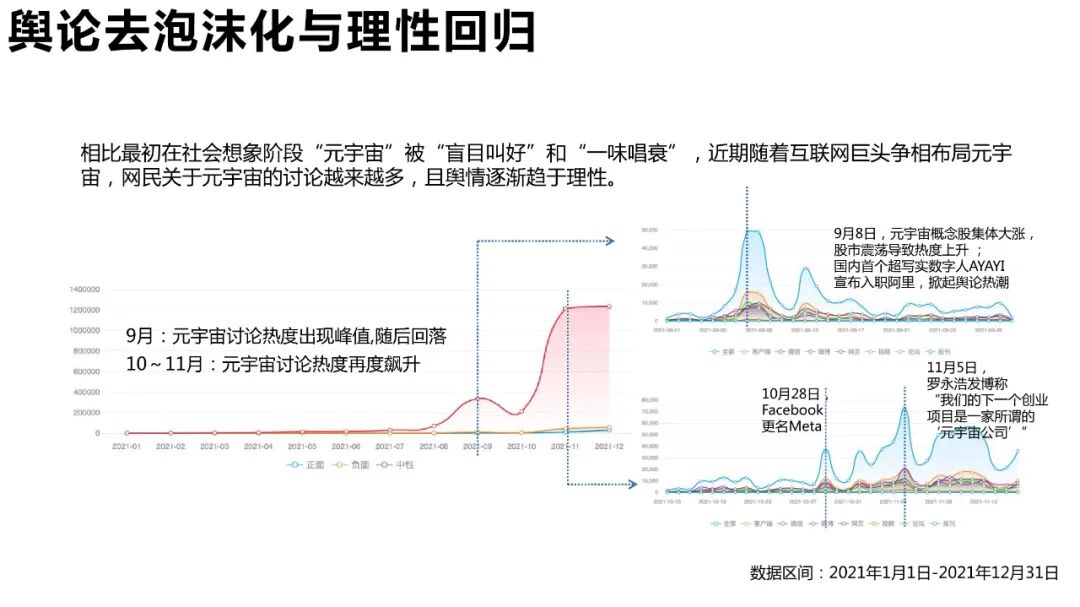 相比最初在社会想象阶段“元宇宙”被“盲目叫好”和“一味唱衰”,近期随着互联网巨头争相布局元宇 宙,网民关于元宇宙的讨论越来越多,且舆情逐渐趋于理性。