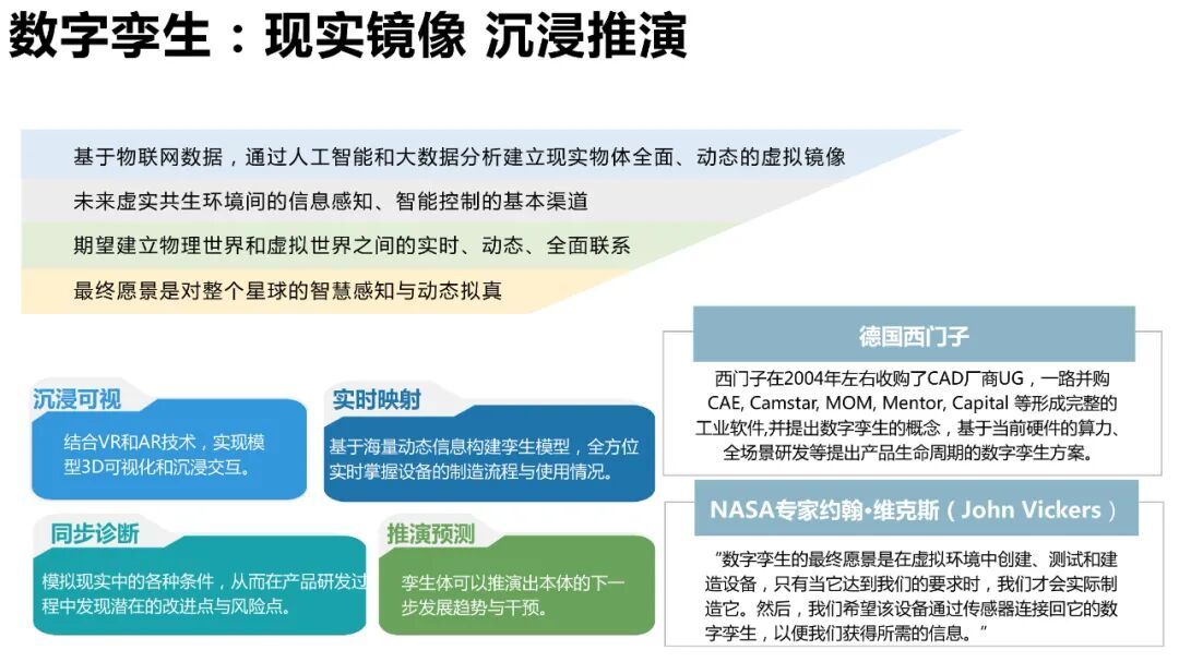 数字孪生:现实世界完全镜像到虚拟世界中,在虚拟空间内建立包括人、物品、环境等要素在内的拟真的动态孪生体。