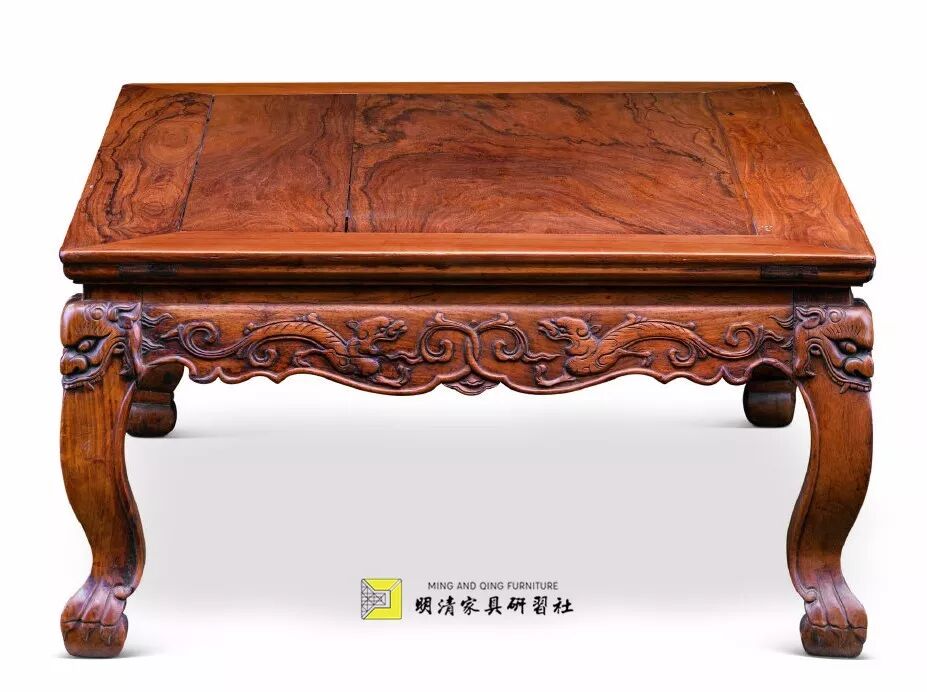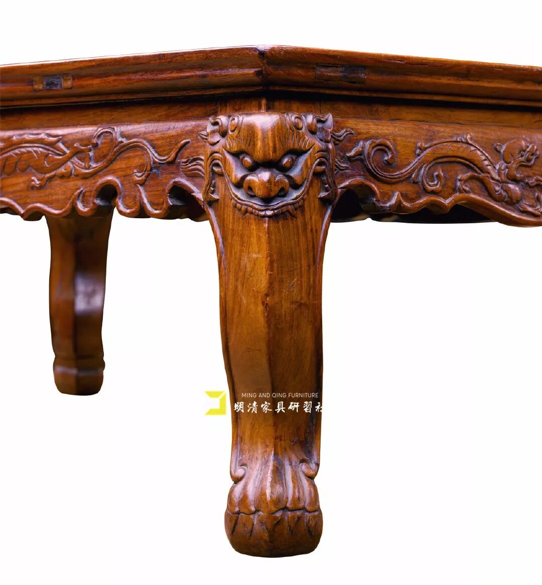 一般炕桌的牙条与腿足之间的相接,均成45度斜角,称作“格肩”。这件炕桌却不然,齐牙条的目的在于维护腿足肩上浮雕兽头的完整,避免因格肩相接而使兽头分为两半。