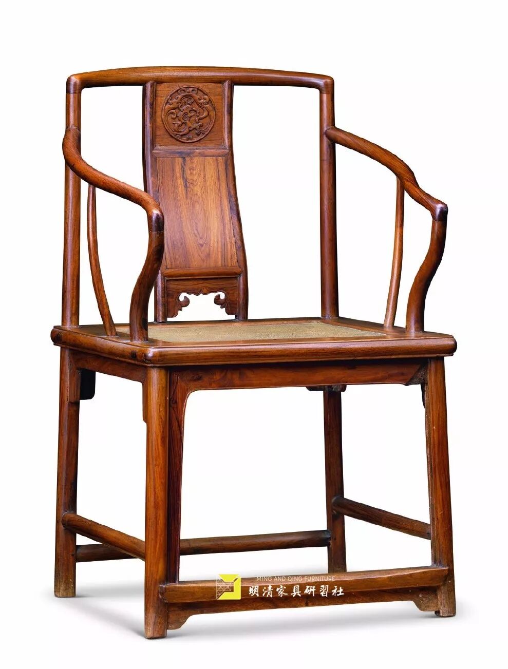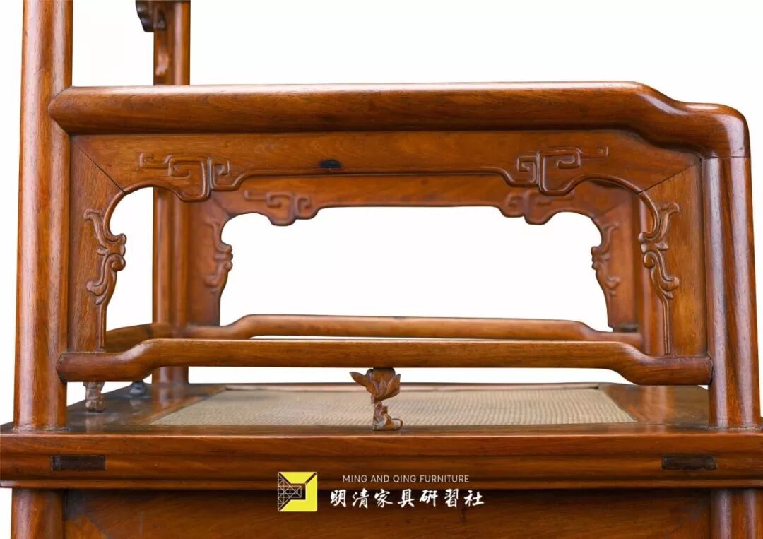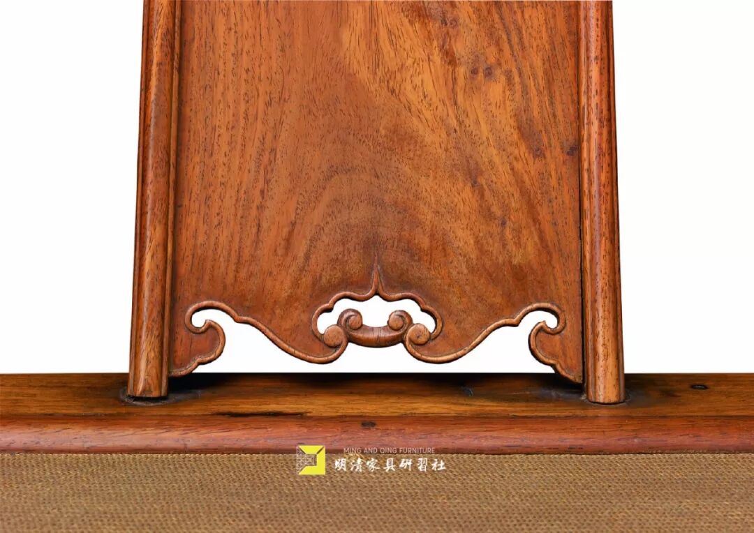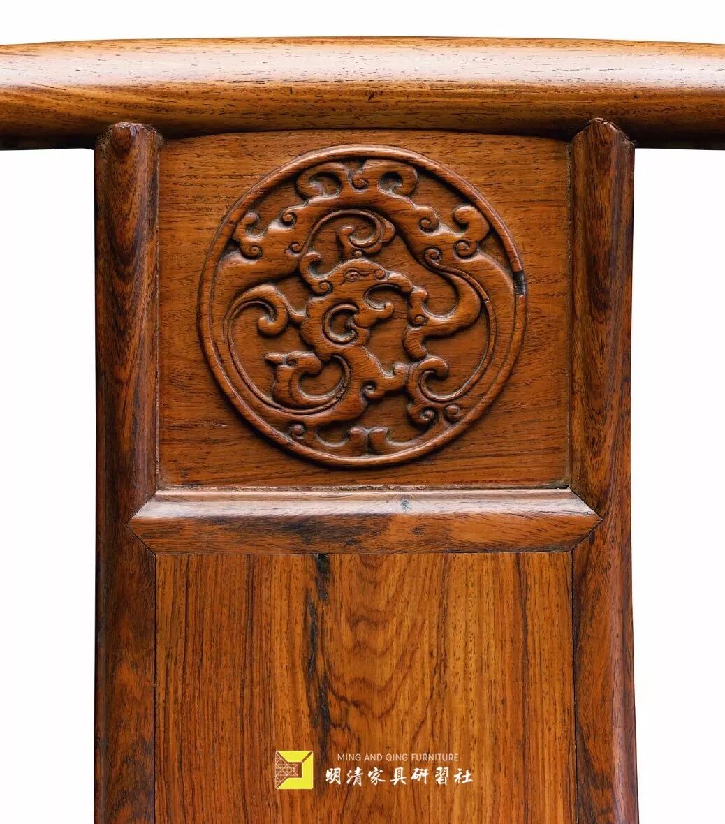 靠背板两边立柱打槽,中嵌一块从上到下的独板,下有亮脚,上有团花。团花做法也很特别,是在靠背板上挖一如意头形洞,另雕一与之相应形状的蟠龙从前面嵌上去的。