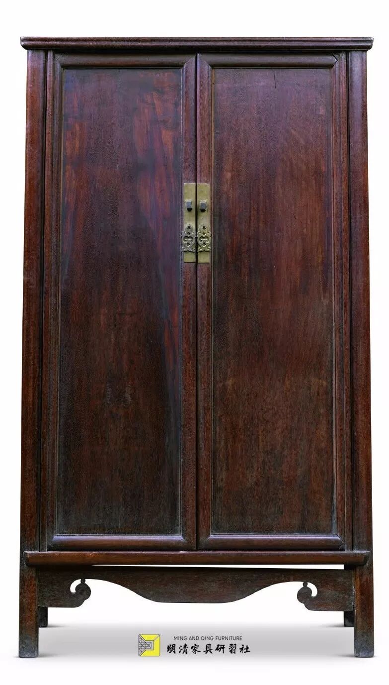 这件鸂鶒木圆角柜形制规范,很有代表性。两门中间无“闩杆”,名为“硬挤门”。柜底无柜膛,底枨下面开槽安装“洼堂肚”券口牙子,两侧镂成内卷云勾。