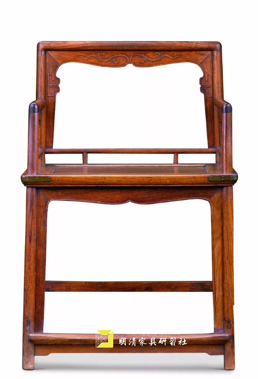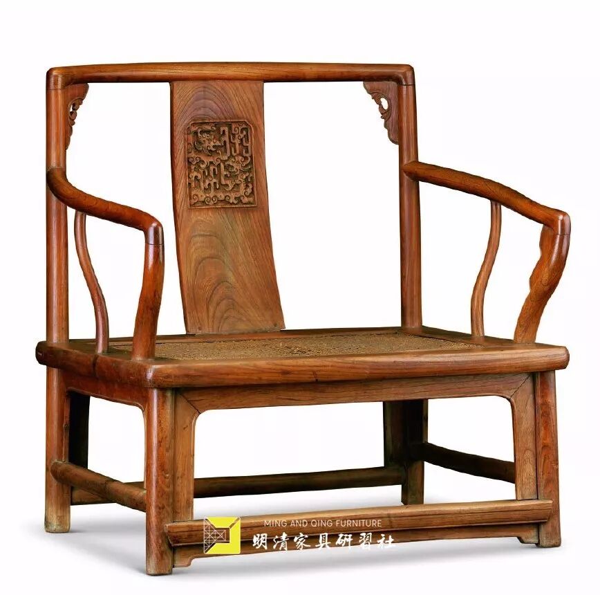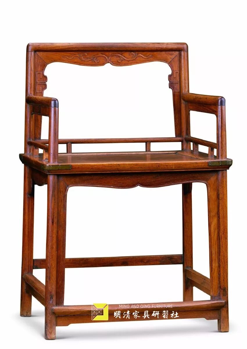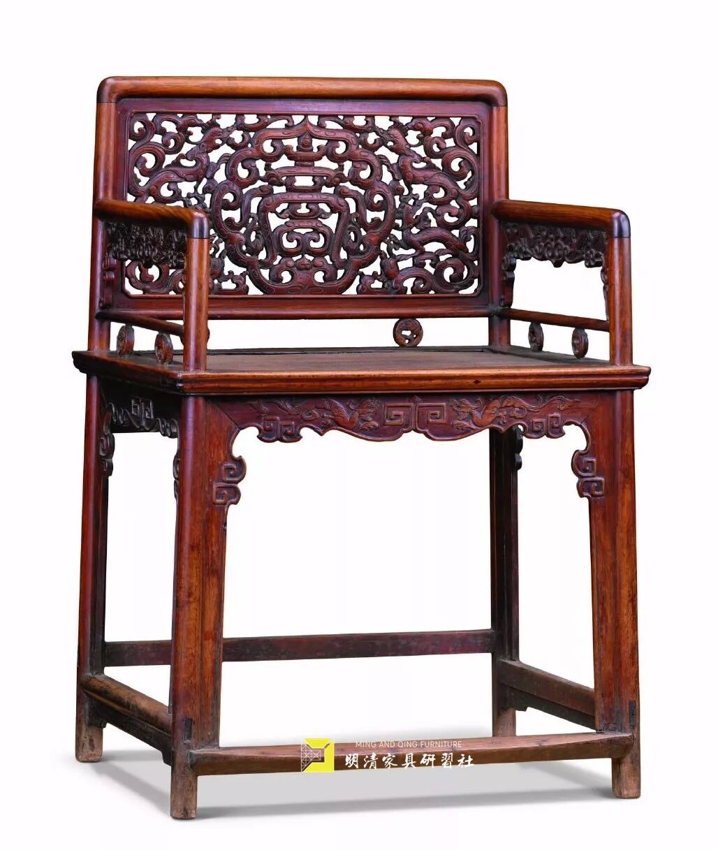 这对椅子具备以上四个特点,但又在靠背、扶手以及牙板上做了大面积的透雕、浮雕纹饰。造型手法掺入了一些清代因素,使得这对椅子具有了明风清韵的特点。