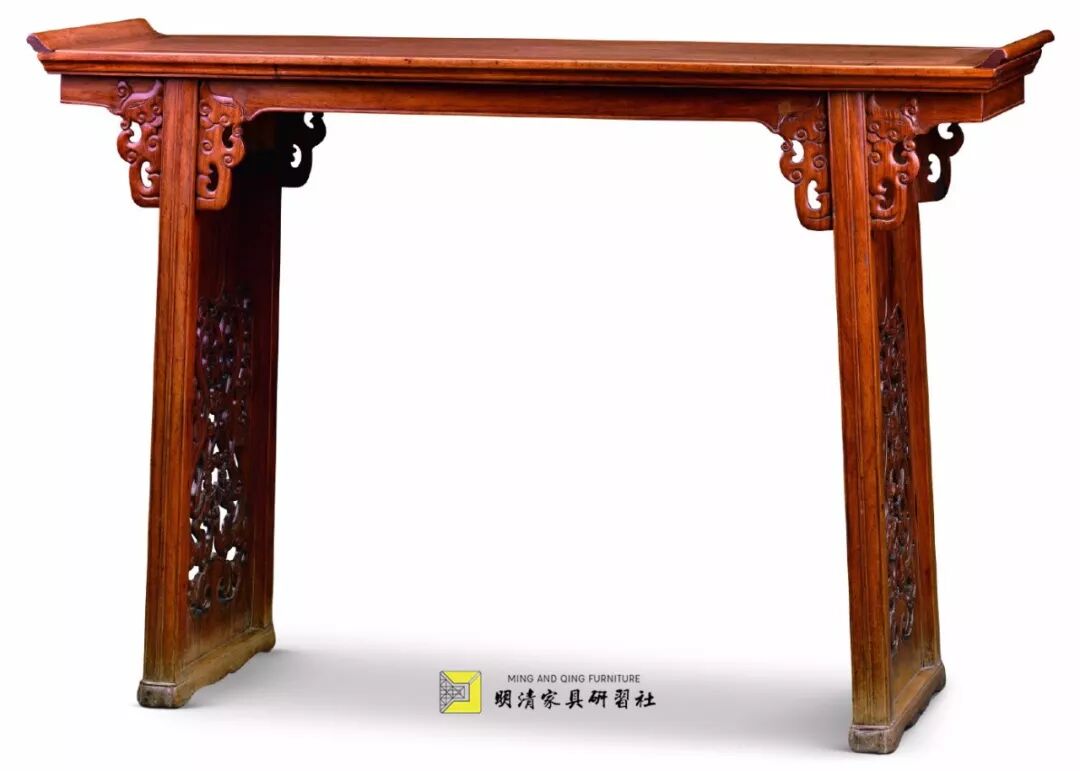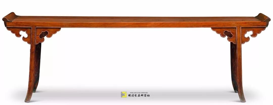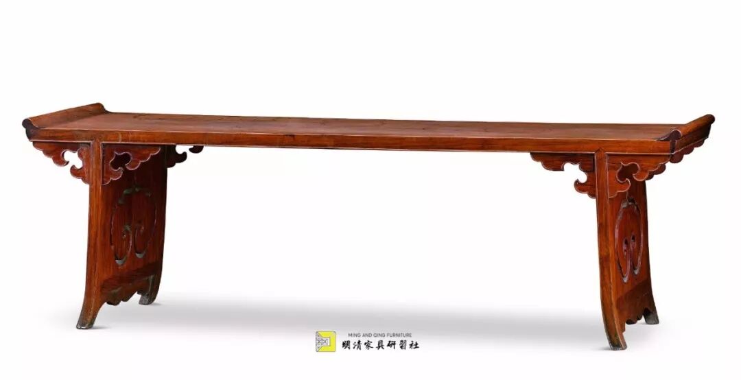 此案是传世矮型家具中的佼佼者,其外撇的腿足不仅造型优美,亦且增加了稳定感。腿间透雕如意云头,腿与面板交界处,嵌镂空云头角牙,与两腿间的大云头相呼应。