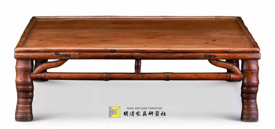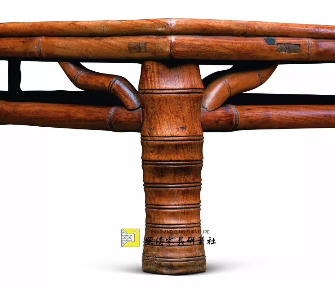 最突出的特点是以木材仿竹材,无论桌面冰盘、四足、直枨,还是矮老、斜枨,一律雕出竹节,四足略做弯曲,着意模仿竹根那种竹节密集、久经风霜的形态,愈显逼真。