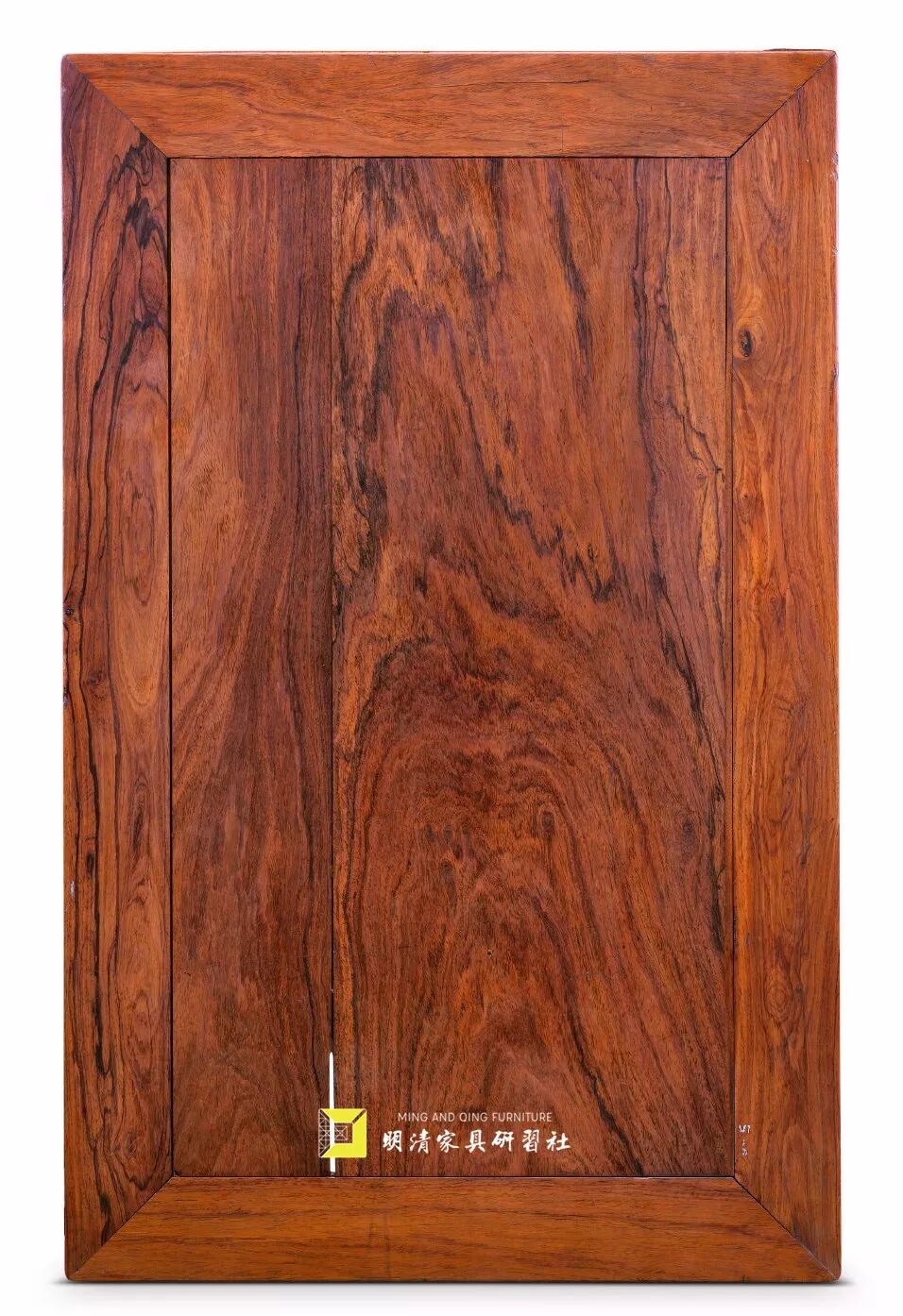 此柜用花梨木做镶框,桦木瘿做面板,松木做后背板。
