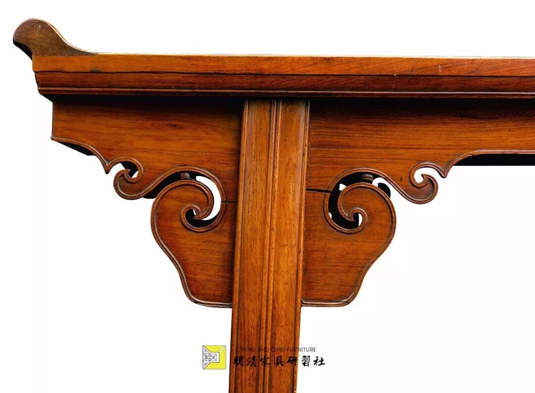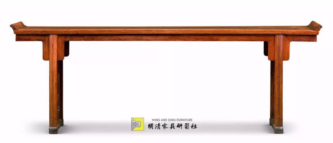 这件翘头案面子用攒边做法,面芯为独板,小翘头。腿截面长方形,内方外弧“两炷香”做法。