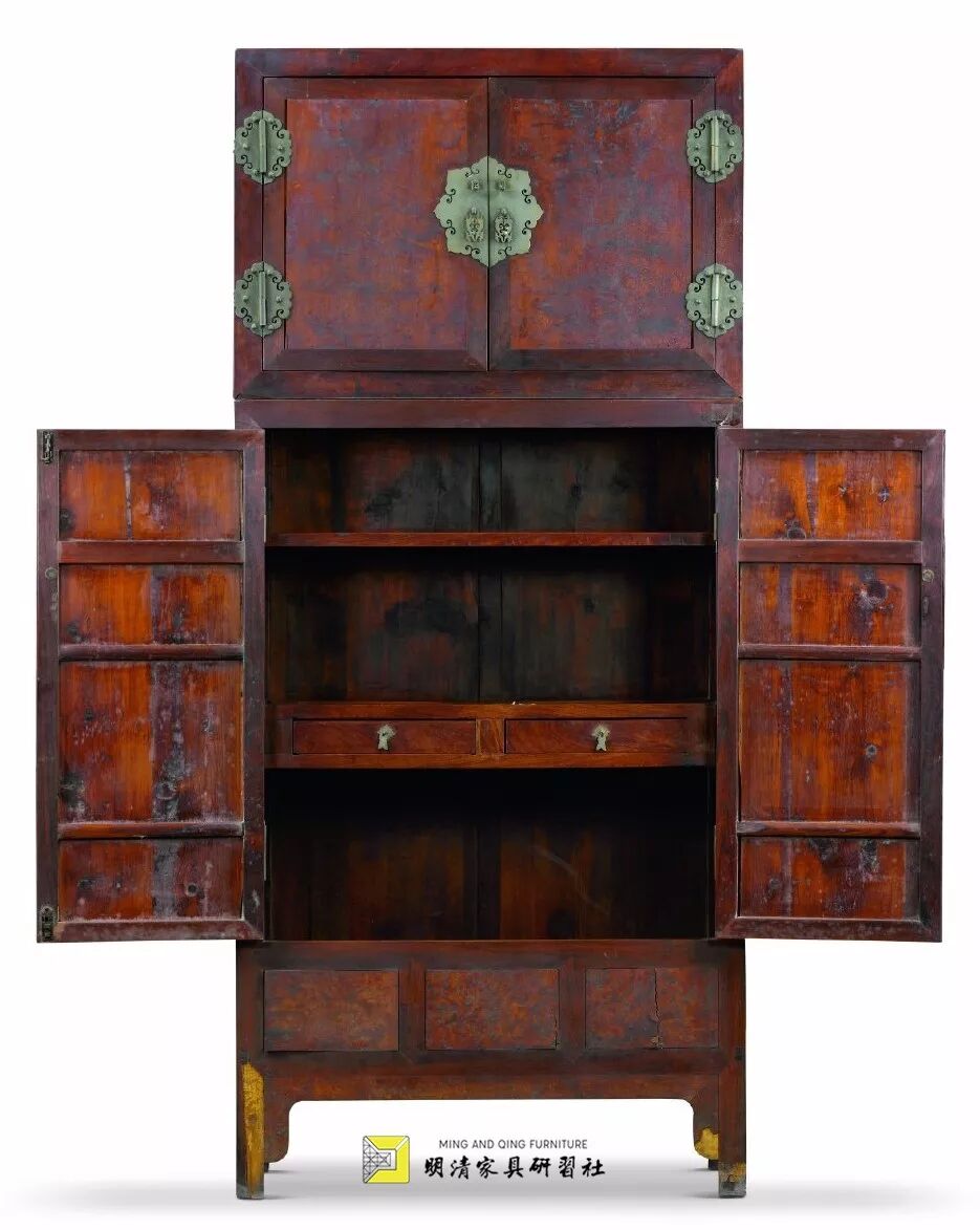 柜内由上而下,第一层为屉板,第二层为抽屉架和抽屉两具,第三层为柜膛,顶箱则只有一层屉板。