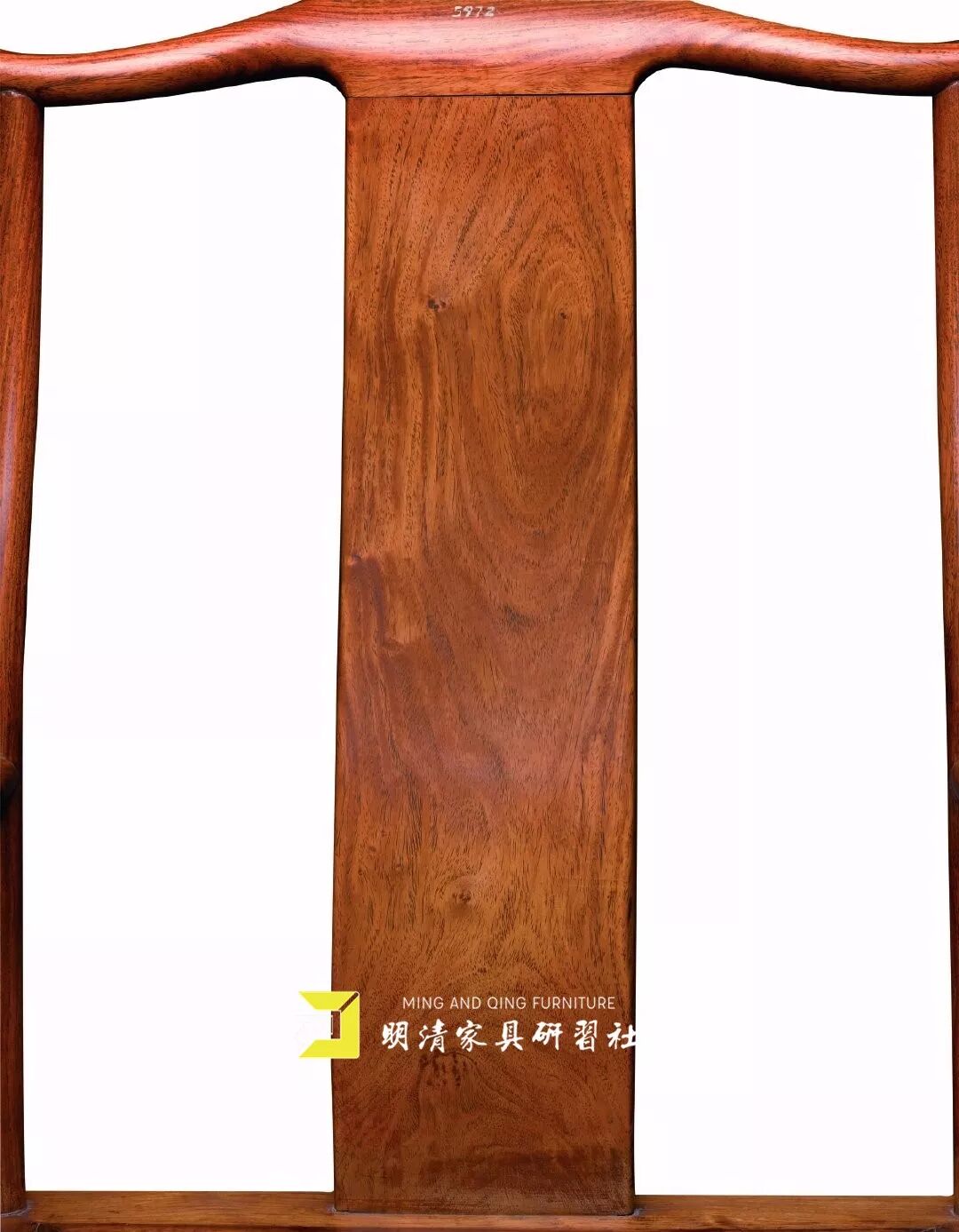 这对官帽椅美在靠背采用了纹理十分漂亮的一块独板做成。因为纹理自然天成,就不必要再进行雕斫,这是古代工匠技艺高明之处。