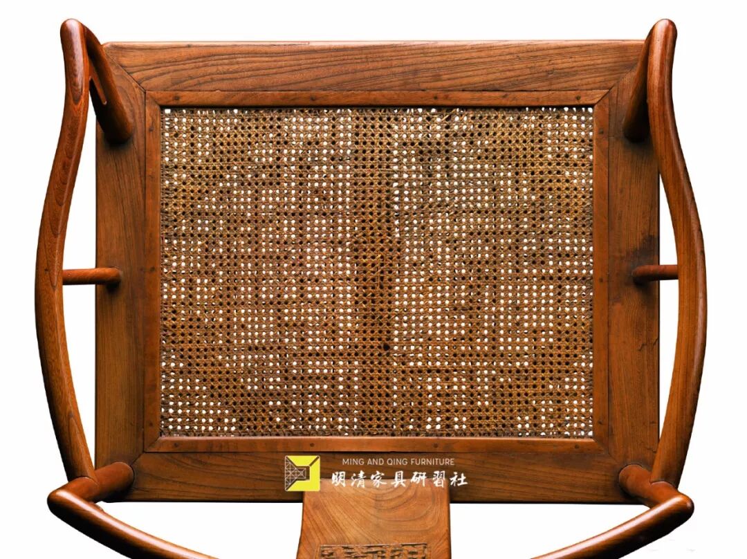 此椅独具特色之处在于背板,一般圈椅的靠背板为打槽装板或独板,板上或全素、或雕刻、或镶嵌。但这件圈椅的靠背板作法却不同于此,它介于二者之间,或者说二者兼有。