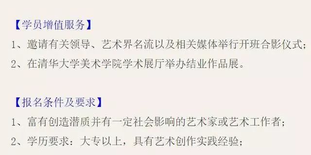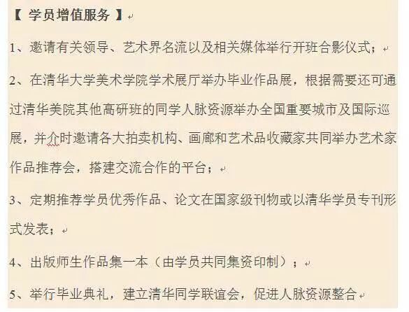 “在清华大学美术学院学术展厅举办毕业作品展”,同样让你以后有得吹,咱在清华办过展!同时,“根据需要还可通过清华美院其他高研班的同学人脉资源举办全国重要城市及国际巡展”。当然,前提是费用你出。