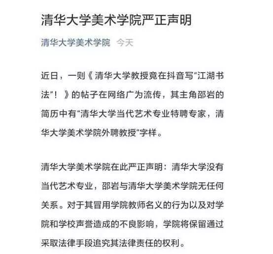 这段“射墨”视频疯狂走红后,自比王羲之的邵岩被骂惨了。清华美院也发了个措辞严厉的“严正声明”——“清华大学没有当代艺术专业,邵岩与清华大学美术学院无任何关系。对于其冒用学院教师名义的行为以及对学院和学校声誉造成的不良影响,学院将保留通过采取法律手段追究其法律责任的权利。”