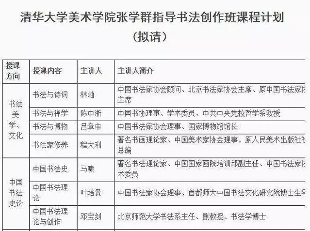 而更早,2011年,清华美院“当代艺术书法创作高级研究班”有个专项是“张学群指导书法创作班”。招生宣传写得很明白,除了领衔的张学群和他的助手,其他的教师,“由清华大学美术学院组织国内书法名家和名师教学”。明确说明,课程表上的各位都是清华美院外聘的专家。
