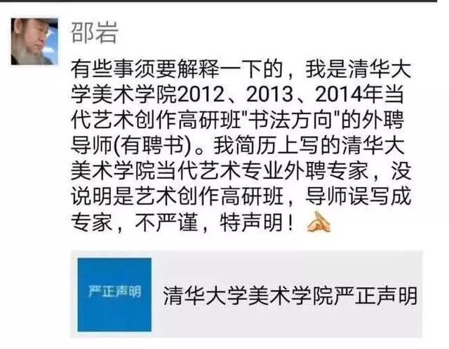 邵岩回应——“我是清华大学美术学院2012、2013、2014年当代艺术创作高研班‘书法方向’的外聘导师,有聘书的哟,亲!”
