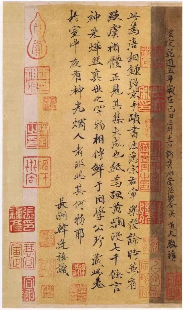 钟绍京抄经书法技法几无人能及,其代表作《转轮圣王经》(实为《长阿含经·转轮圣王品》) ,前后题跋共有十八处,从中可以看出,欣赏者不乏知名人物,如元代仇远,明代韩逢禧,清代梁章钜、张之洞、李文田、吴大澂、赵之谦等。而在元人题跋中有一条曰:“……虎林盛彪……钱塘仇远、同郡曹良史, 至元甲午二月十一日同观于困学斋。”困学斋属鲜于枢斋名,虽难以据此认定此物即是鲜于枢的藏品,但至少可以说它曾为鲜丁枢寓目过。