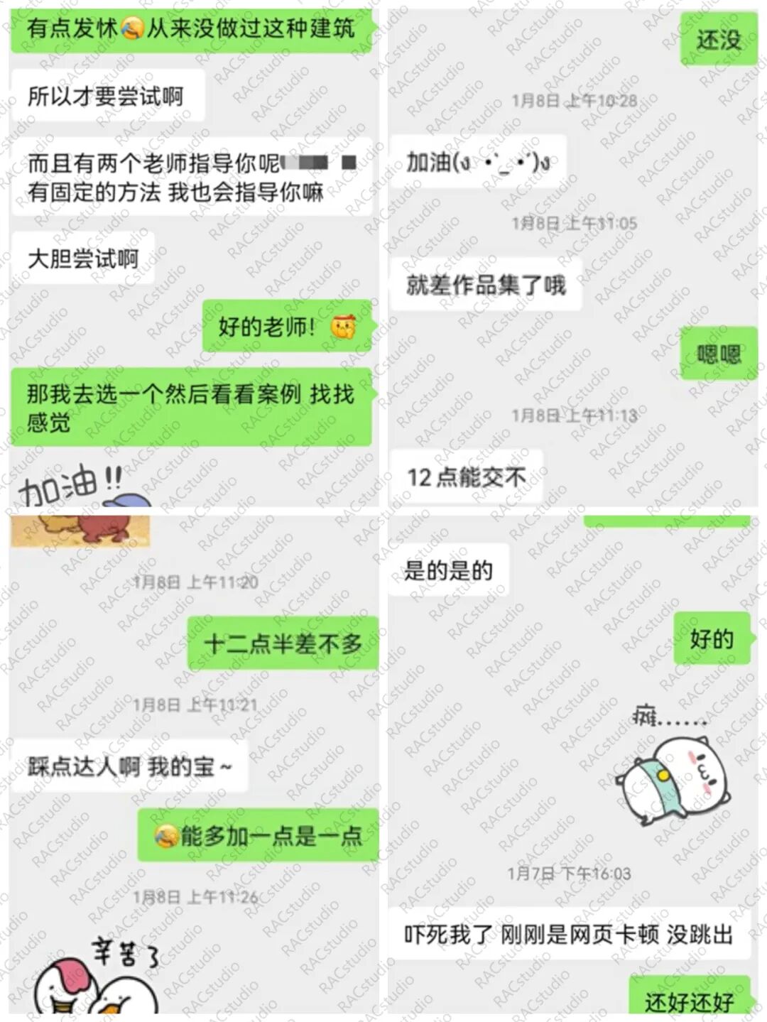 Carina老师和Jasmine老师作为申请老师也非常负责,尤其是Carina老师,真的要给你比一个超级超级大的爱心,感觉carina对待我俩跟对待自己的宝一样哈哈哈哈,和我们一起经历压线交作品集的快感,帮我们整理相关申请材料,真的省出来一大笔时间。项目老师各有特色,闻昭老师思路很清楚,和她上课非常高效,同时对图纸的要求很细致严格,非常感谢您耐心的指导。