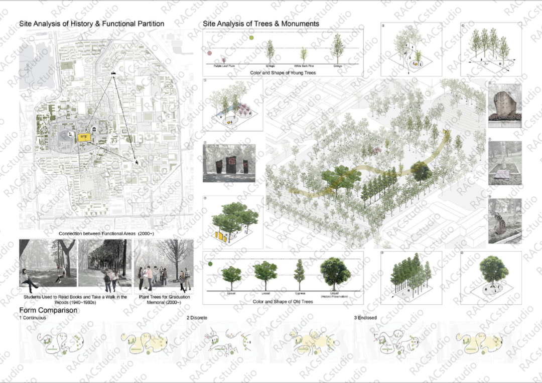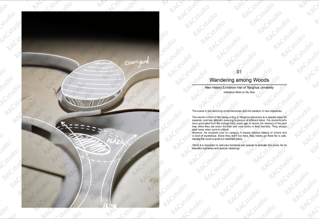 这个项目是从前的一个遗憾没做好的地段重新做的设计,自拟任务书,算是一个介于建筑和构筑物之间的项目。出发点是场地上茂密而姿态各异的树,希望因树制宜,创造一些小小的空间场景序列。