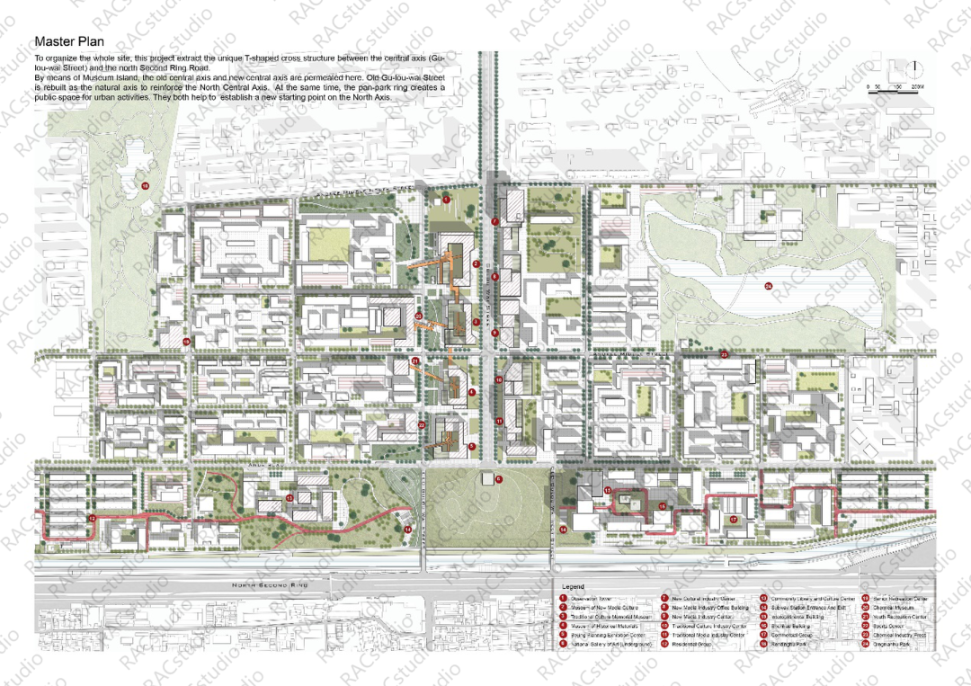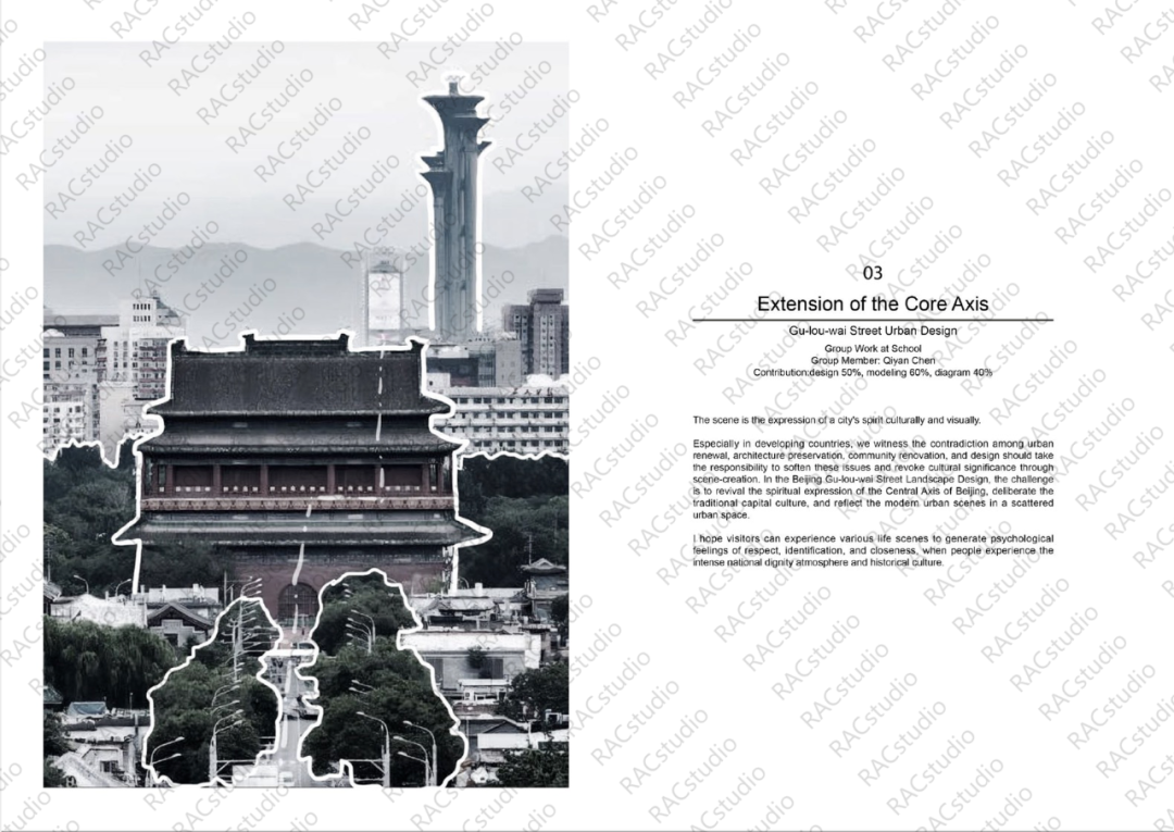 在北京北中轴线的城市设计中,为了能够使此地区呈现其应有的国家尊严和中心气质,我对北京、西安、合肥等中国古代都城营建格局方式进行了大量的研究,确立继承古代肌理的北中轴两侧平衡非对称的设计原则在此基础上,为了凸显北中轴起点的重要特征,又对自永定门到奥林匹克公园中轴上的重要建筑和景观高点进行视线的研究,为北中轴起点和中轴两侧的建筑高度确定提供依据。同时调研到老北京居民生活需要更现代化的建筑,更舒适的人行系统和更便捷的道路。针对具体需求,设计主要集中在街区内部建筑质量的改善、街区之间道路及两侧人行系统的优化、河畔高层建筑底部的开放和公园设计。
