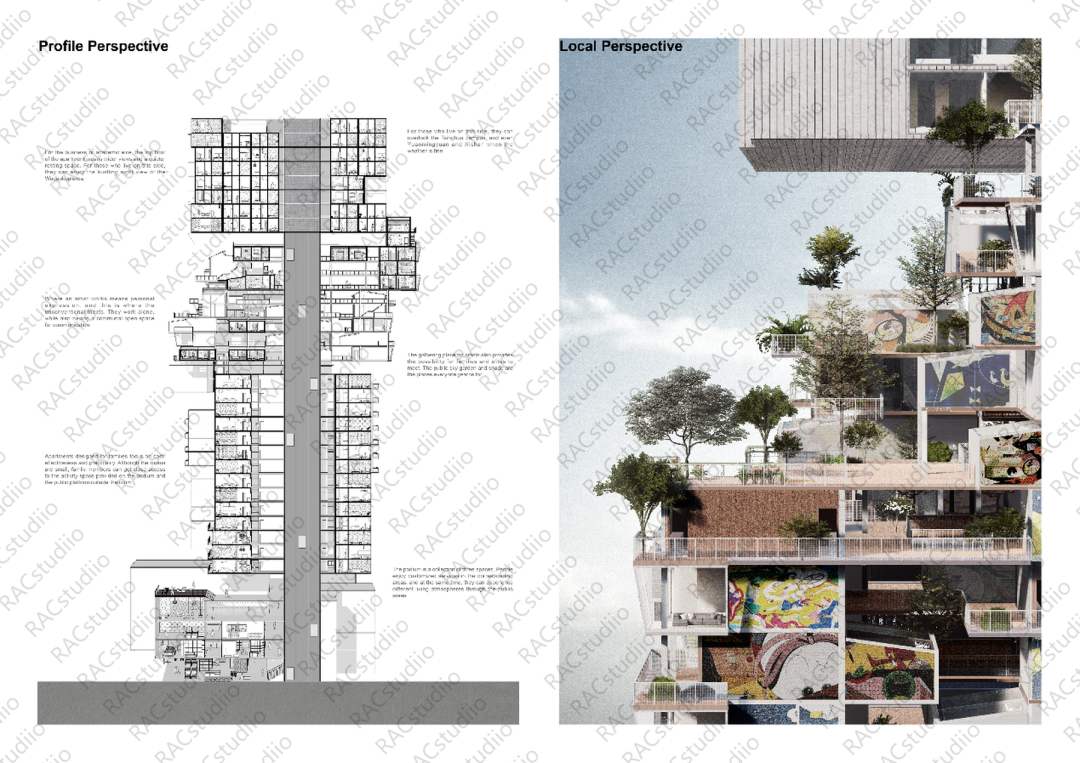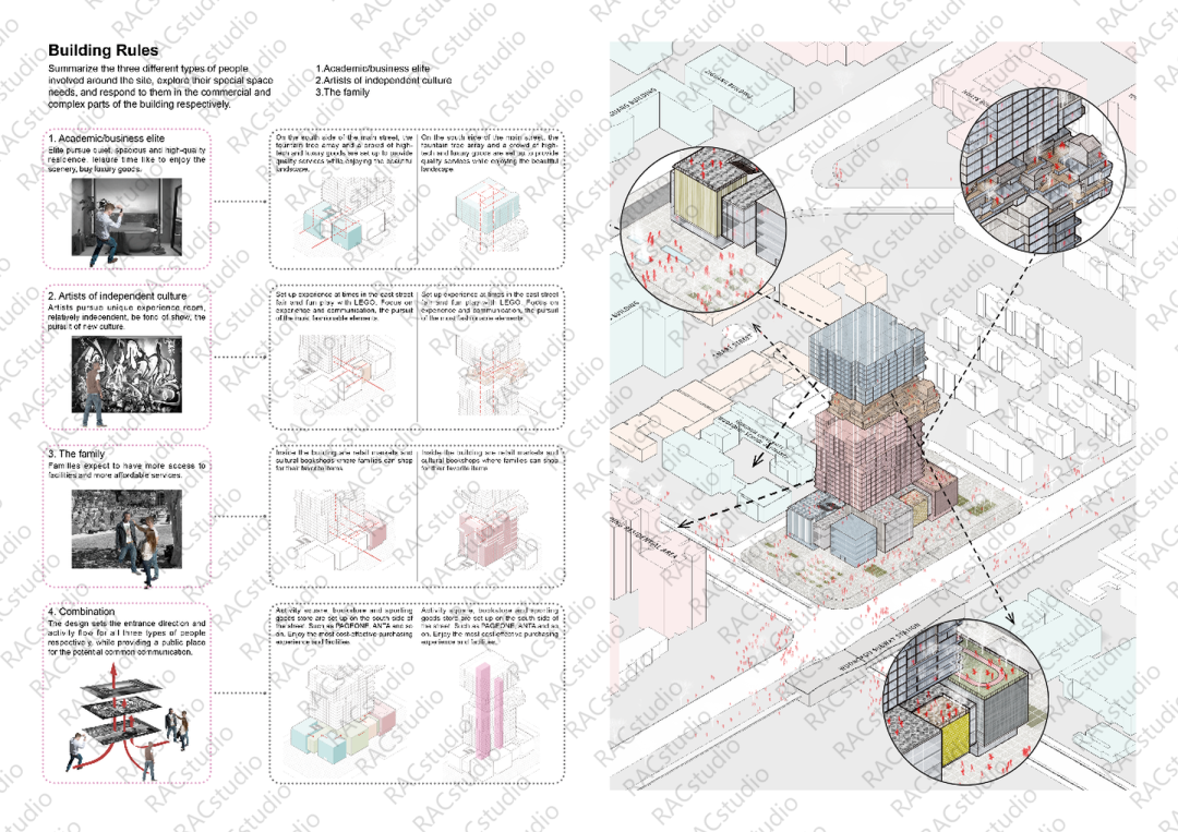 我认为建筑的文脉线索体现在建筑对社会矛盾的回应之中社会中各阶层间的矛盾分布于各时空与地理间,而建筑师有责任对社会矛盾进行反思和补救。作为首都,北京以其丰富的资源和机遇包容着来自不同层级的人:有务工人员,也有高知分子;有科研精英,也有艺术个体。但是他们各异的生活方式和行为习惯却独立出一个个的平行世界,彼此间时常因为不了解而引发偏见,使得人与人的关系变得淡漠。五道口区域即是这样一个复杂和冲突的代表,四周丰富的业态带来了种类繁杂的人群,有商业精英和艺术工作者,也有普通家庭与大学生。为了增进不同人群相互间的认知,是应该将这几种人群完全融合,或是在隔离和融合之中寻找一个边界?整个设计过程即是对新的平衡模式的探索,尝试的设计类型是一个底层商业上部公寓的商住综合体。建筑底部的商业针对不同人群的购买需求进行了相对的区域限定,但通过一层公共空间的打开和通高中庭的景观设置,又为人们在享受公共空间时提供了相识的机会。公寓部分则是根据不同人的主要需求进行分层设计,通过设置不同流线避免相互打扰,研究对应的模块单元满足了差异化需求。