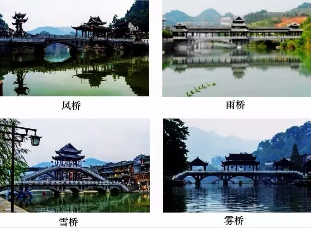 风桥、雪桥、雨桥、雾桥,从整体设计风格上看,仿拟了西南少数民族的风雨桥,纤长秀美、古朴典雅,建筑造型随着风、雪、雨、雾不同的气候变化,演绎出不同的风采和意境。