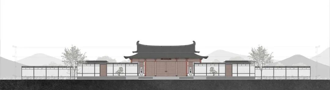 在到达入口前的空间流线上,青墨设身处地为参观者营造了一个大气磅礴的御道空间序列。自宽约57米、高约10米的第一重仪门起,唐风即扑面而来,其造型源自长安城大明宫主殿,颇有大唐的华美气度。整个建筑沿街面对称布局,围墙按唐样分割,叠涩台基搭配勾阑、圆柱、直棂窗、鸱吻等唐代元素,利用现代材料演绎,无不蕴含唐风建筑的大气和精巧。