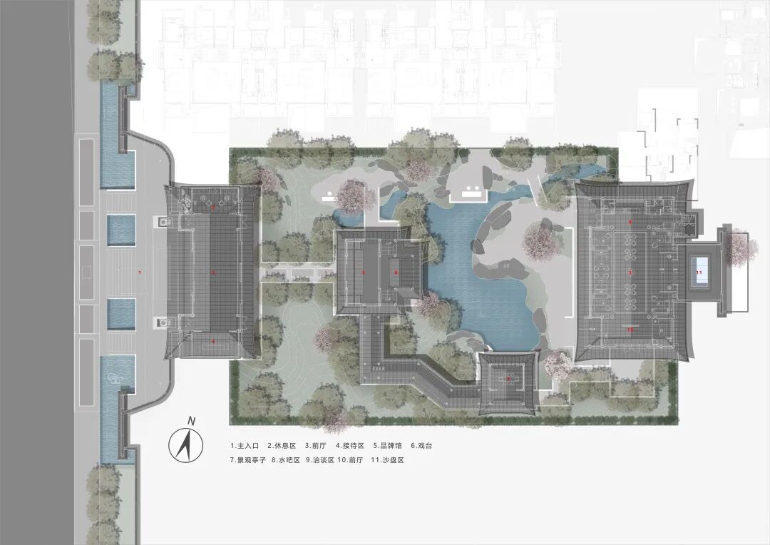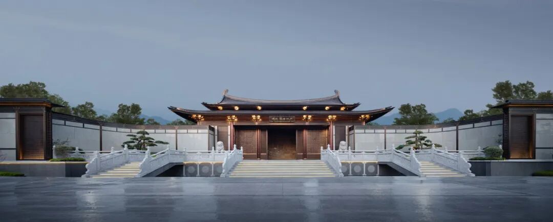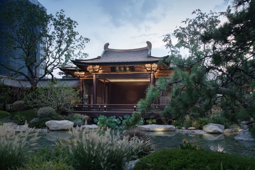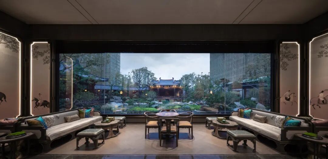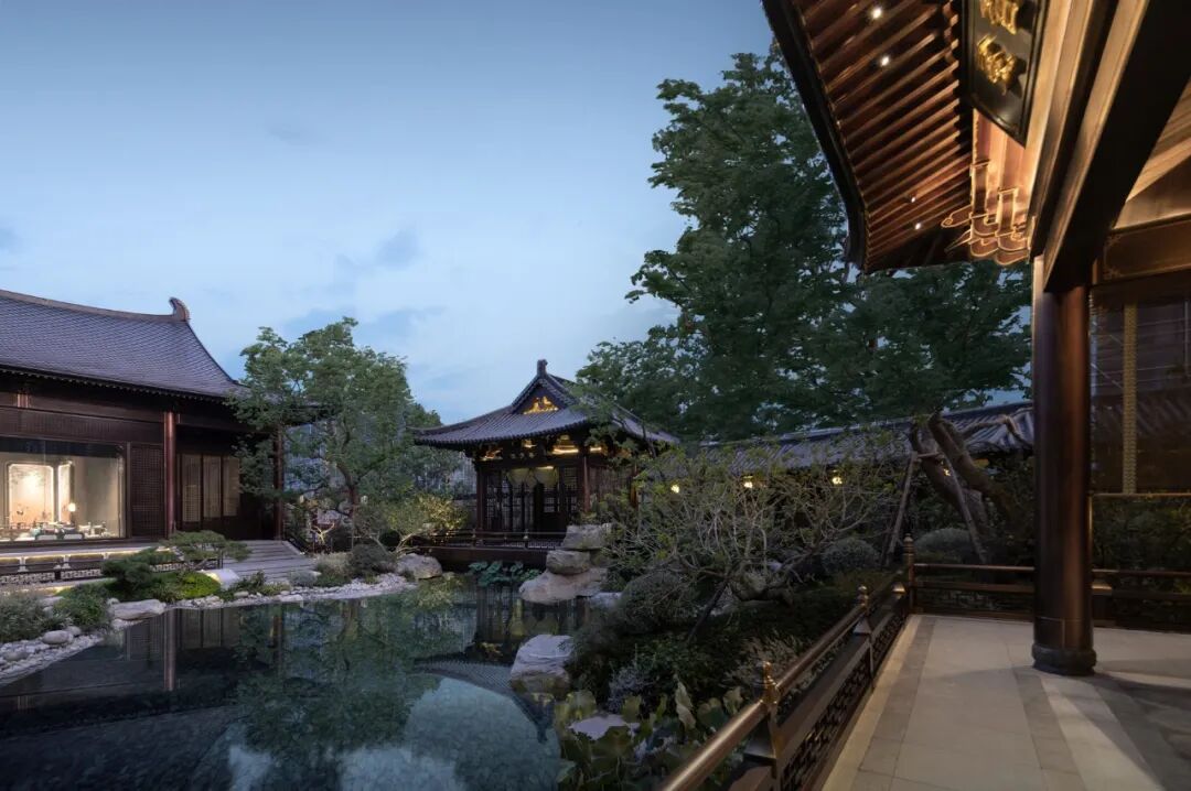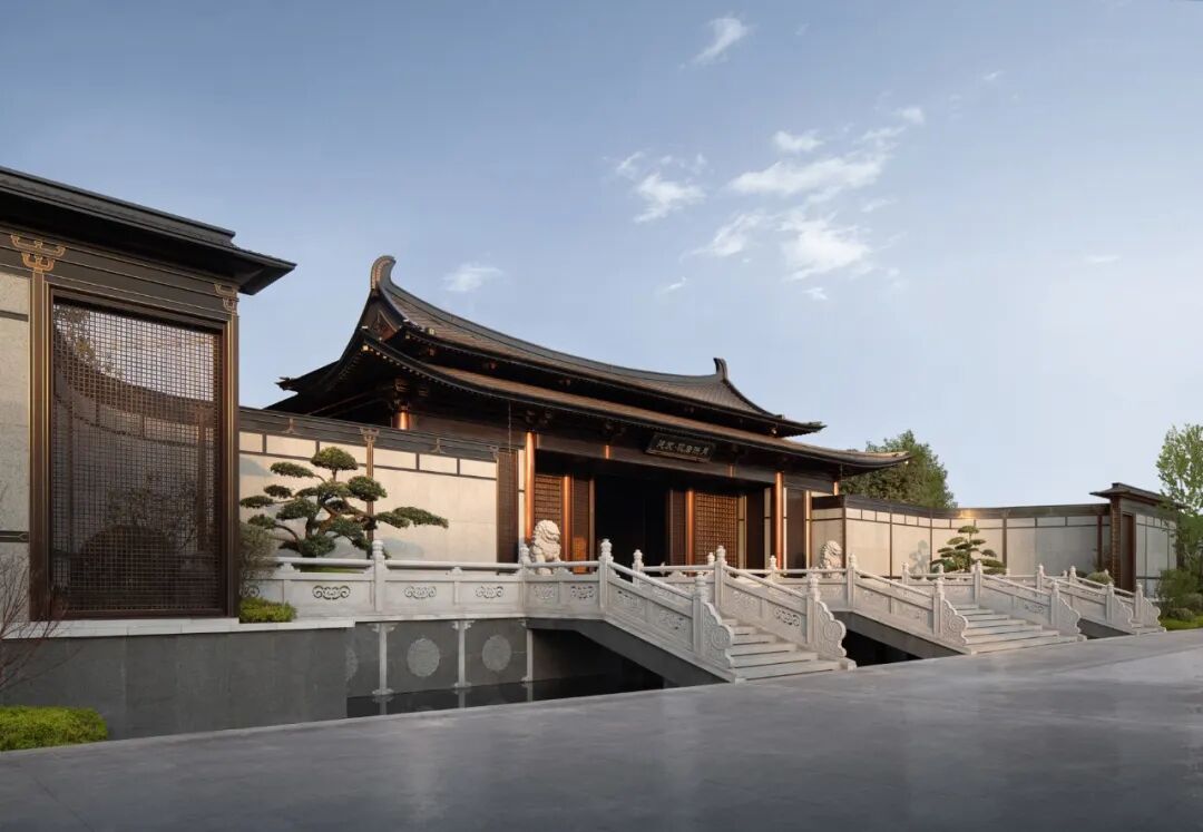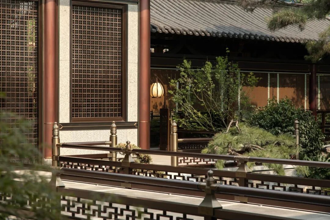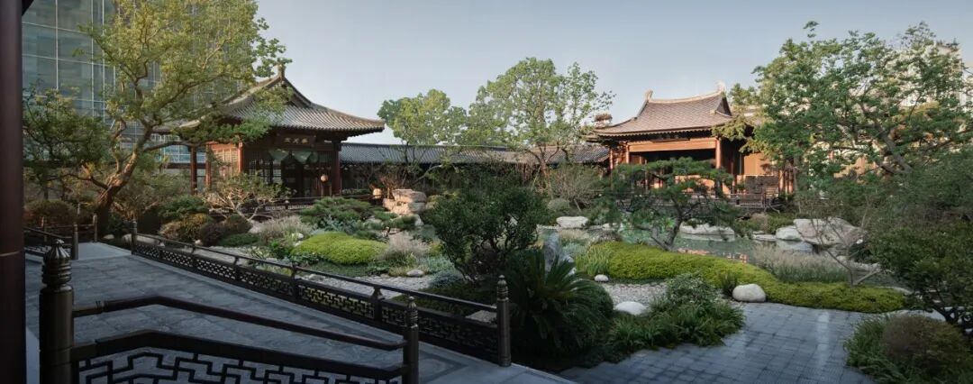 从主入口昭示面沿着台基拾级而上,大门向两侧移开,以传统山水画为背景的照壁逐步展现,富有人文气息且大气磅礴。走出第一境,走廊两侧高筑的台基、勾阑,搭配下沉的景观庭院,像是一种内外隔绝,使人产生强烈的动静对比。布局上,二进小院流线通达而不通直、连贯但富于转折;轻盈小巧的建筑体量,与一进大门的威严大气形成有趣的对比。景观上,多用方池、独石、松梅竹兰等植物,体现了古人舒朗、雅致、禅意的审美情趣。