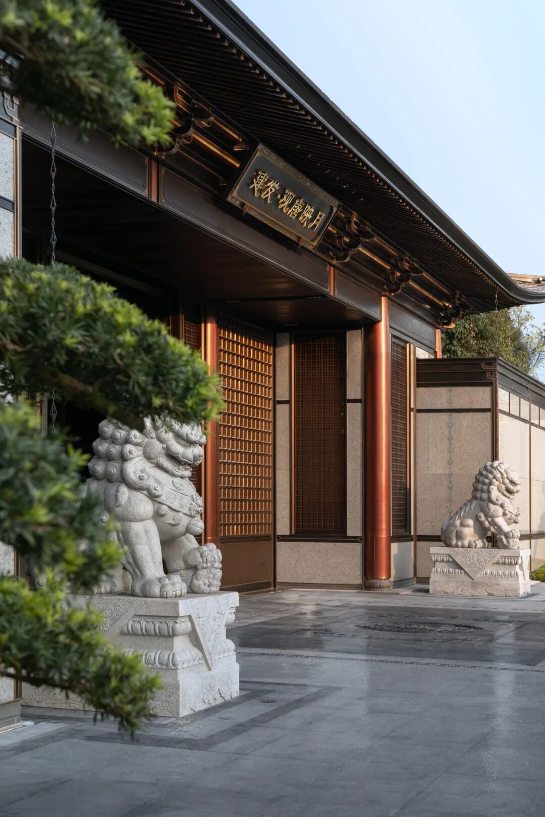 大门两侧的石狮子形态威武,和太和殿门前的石狮子是同款。而九级台阶、护城河、唐代石栏杆、照壁景墙以及复刻《京畿瑞雪图》的屏风和定制的芙蓉纹样石砖,都把品质、文化、细节拉满。