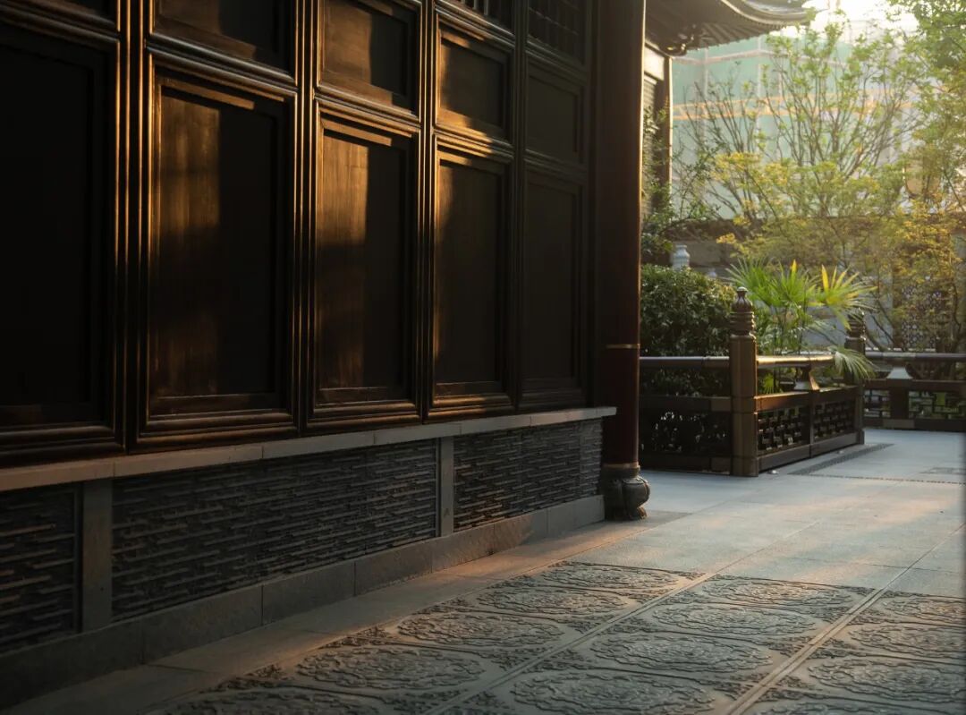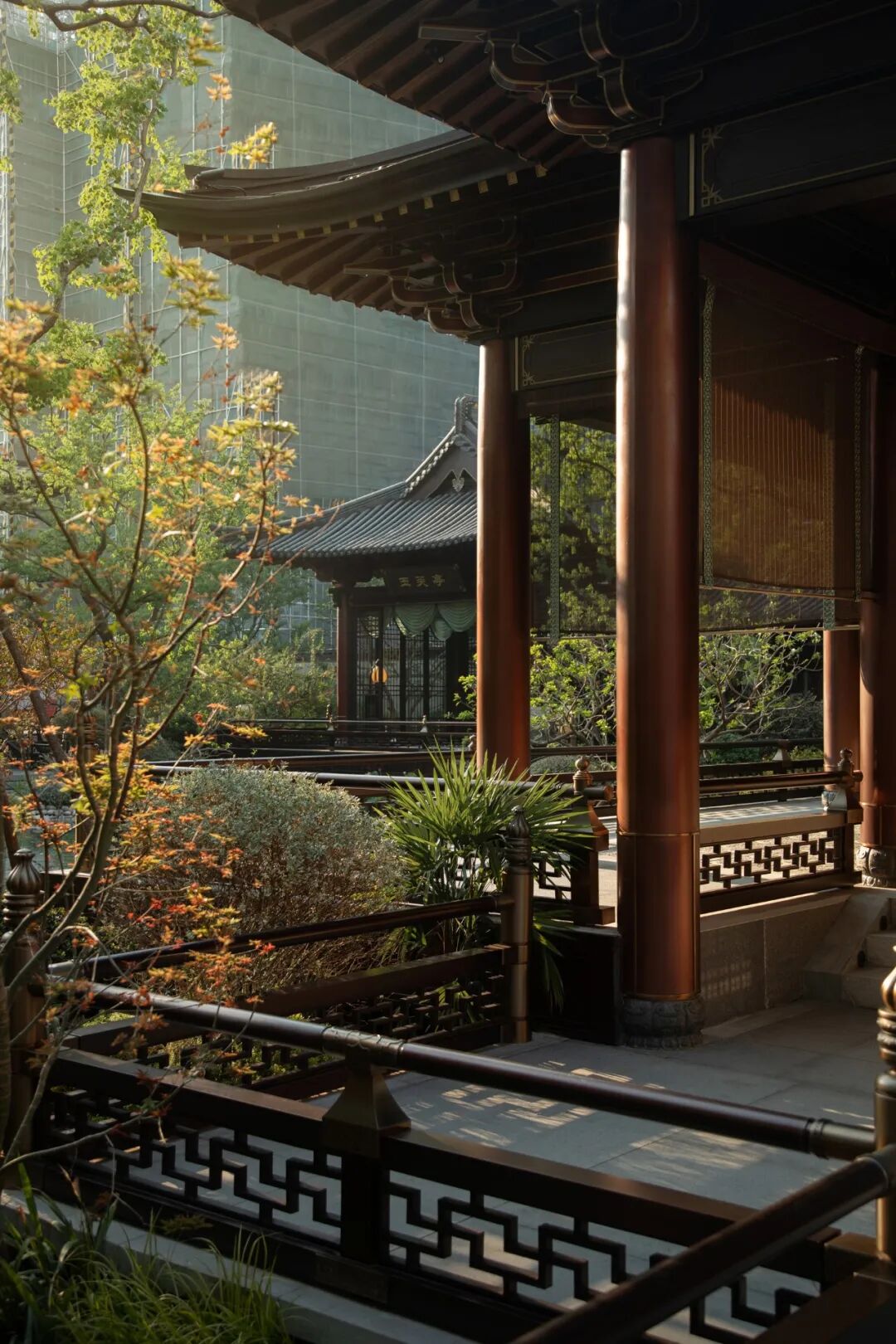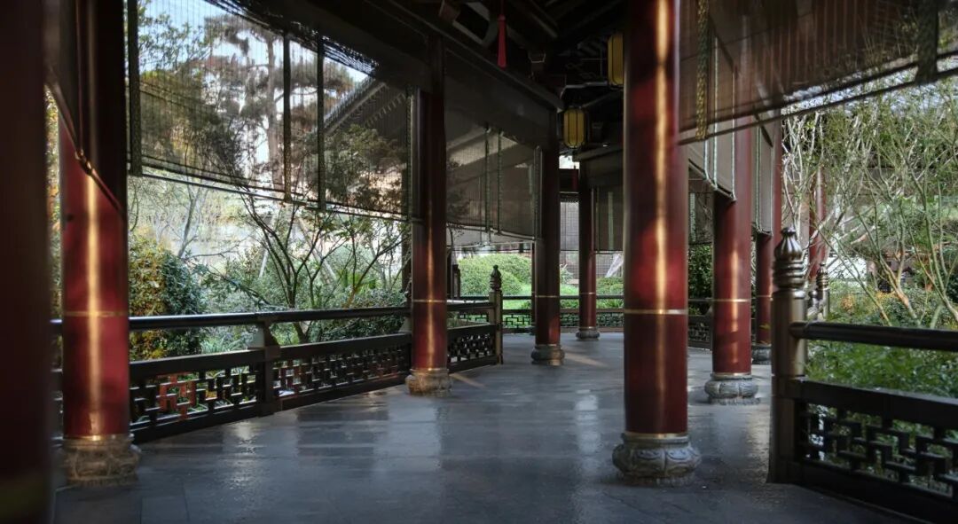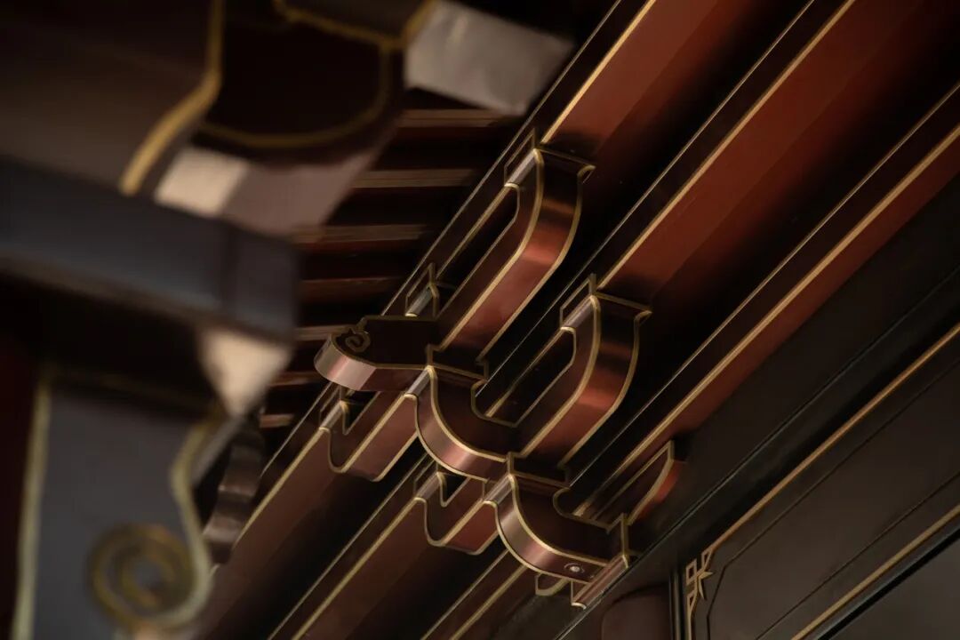 在巨大而厚重的屋顶下面,承托重量的柱子则多以朱红色为主。通过对色彩的整体把控,强调材色深浅搭配,明暗对比,呈现沉稳、大气、雅致的感官体验。