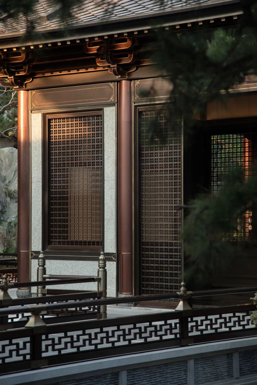 主入口两侧纹样做卍字纹;游廊处不锈钢仿铜色斗拱,造型更加优美、壮观,尽错综之美,显技巧之变;椽头做金属扣盖,绘栀花纹,纯手工拼接。柱础为组合式,上部为金瓜式,施以如意纹,下部为覆莲式,施以莲瓣纹;梭柱形体圆润饱满,上下端部交接处均做收分;山墙悬鱼装饰构件,依唐风而略作伸展。