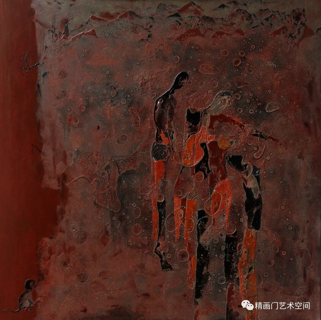 作者重视自身内在的体验,以内心自由的生命状态作为艺术的文化立场。《觅山》《闲山行隐》通过人形、山水、他石诸多抽象图示,画面色调幽暗,复杂的“叙事”隐含在多层次画面,肌理粗细、薄厚、色块营造出了一种神秘幽静的氛围,或是对当下整个人类精神及行为的某种质疑,似乎捕捉到所处社会结构的转型在其作品中的些许辐射,进而串联起对图像视角和社会性的追本溯源,对精神纯粹与艺术本质的探索,向观者呈现其现阶段对艺术的重新思索。将当代漆画探索进入到精神领域的原初语言层面,为寻找精神意义的不断升华铺平了道路,重新松动观者对现实世界的看法,创造出新的认识空间,得以感知中国当代艺术生态下独具文化地缘性的鲜活光芒,包括对人类共通的当代审美经验与哲学意味。漆作《女人体系列》从固有常态中抽离自我,模糊边界,形塑人体的意象,始终进行着精神思考与视觉传达方式之间承载关系的测试,重构寻找出一种新的语汇尝试和艺术创作的可能性与延展性,冀希为观者带来更多崭新的视觉体验,将不同语言的经验汇聚于平面制造的幻像中,就是想找寻极度方法的自由与思想的契合。
